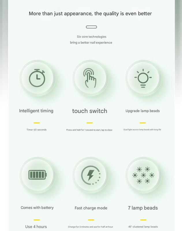 - Curing Note: If nail polish is not fully dry after 60 seconds, it might be due to a sticky residue (floating gel), which can be wiped off with a cleaning solution.