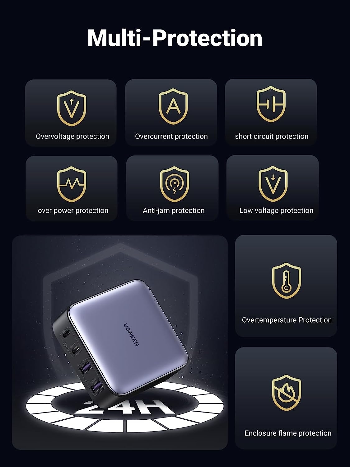 Featuring Dynamic Temperature Sensors that actively monitor temperatures and an intelligent PMW chip that adjusts power outputs to safeguard your connected devices. A UL94-V0 rating shell along with an efficient heat dissipation structure ensures safe overnight charging.