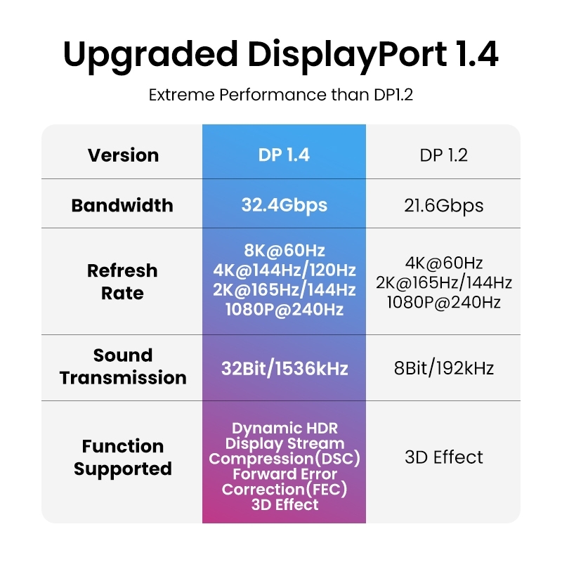 DisplayPort 1.4 Cable supports transmission speed up to 32.4Gbps Bandwidth, resolution up to 7680×4320, refresh rate up to 8K@60Hz, 4K@144Hz, 2K@240Hz. UGREEN 8K DP Cable supports Dynamic HDR and HDCP 2.2. Backward compatible with DisplayPort 1.3/1.2.
