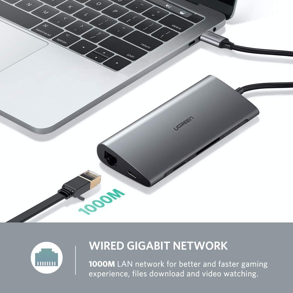 1. MULTI PORTS USB C DOCKING STATION: Compatible with Thunderbolt 3 port, UGREEN USB-C hub easily expands your MacBook with 1 HDMI, 1 VGA, 1 RJ45 Ethernet, 1 Type-C Power Delivery 3.0 charging port, 3 USB 3.0 Type A ports and SD TF card slots