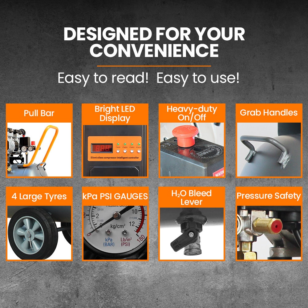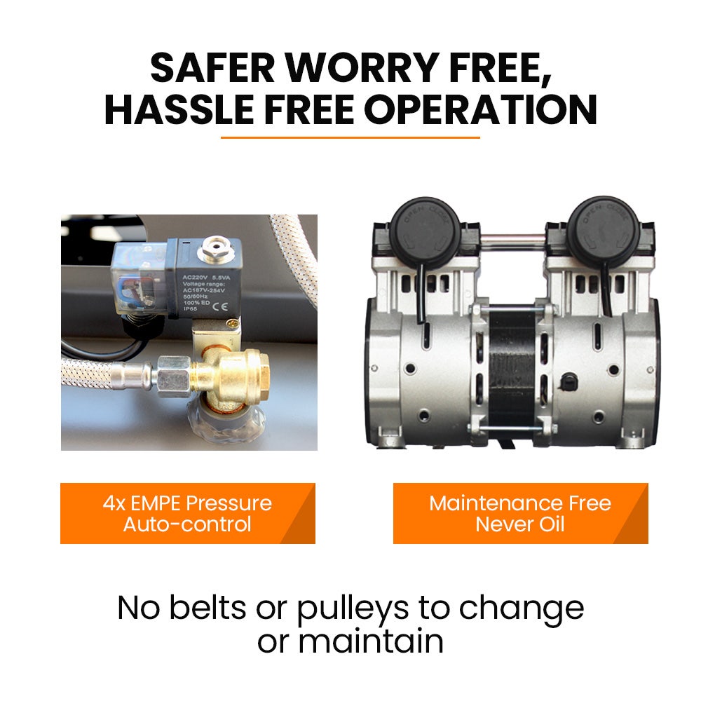 Enjoy maintenance-free operation with this oil-free electric compressor—no engine maintenance, belt replacements, or pulley adjustments needed.