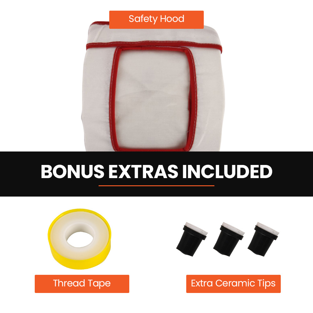 Featuring an easy-to-use media delivery gun with a spring-loaded auto-closing nozzle, and four ceramic nozzles. The portable blaster removes paint, rust, and corrosion easily. The long 2.5 metre hose reaches into tight spaces, while safety features like a feeding valve, non-slip handles, and fixed feet ensure peace of mind during operation. The kit includes a safety mask, thread tape, and funnel, making it a “”ready to blast”” solution.