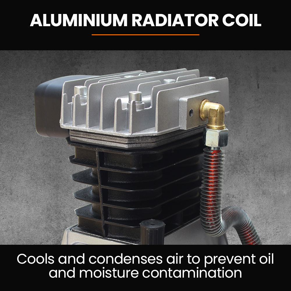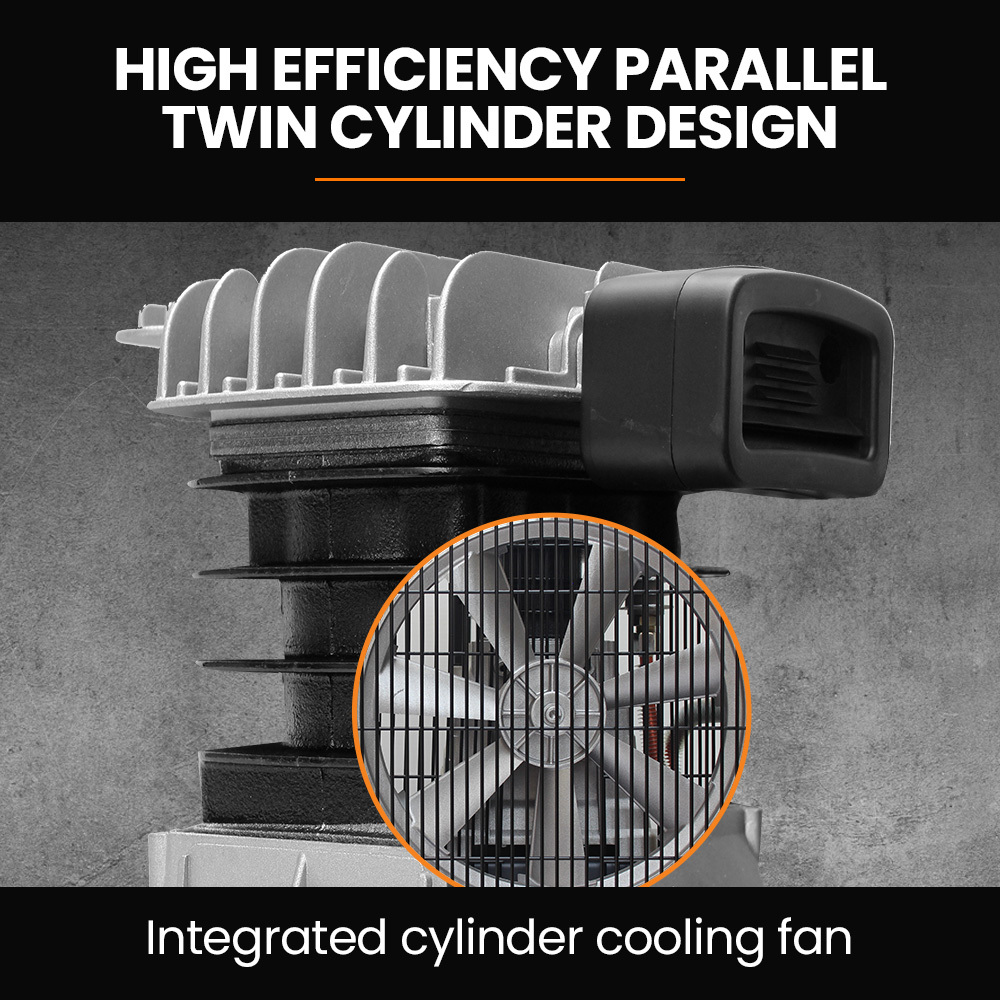 The heart of this machine is a robust cast iron parallel twin-cylinder compressor with aluminium pistons. An integrated aluminium after-cooler, assisted by the integrated fan in the drive pulley, ensures less moisture and contamination in your air hose. The cooler output air temperature also contributes to the compressor’s overall efficiency and performance. The unit also features a pump speed of 920 rpm and a duty cycle of 0.75, ensuring consistent and reliable performance. The pump has an outstanding air displacement of 280L/Min (9.9 CFM), giving it powerful air delivery for demanding applications.