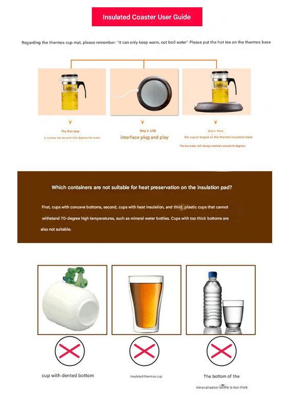 • Constant Temperature Maintenance: Keeps your hot beverage warm (around 55°C), preventing it from cooling down. Please note: This device is designed to keep warm drinks warm, not to heat cold drinks quickly or boil water.