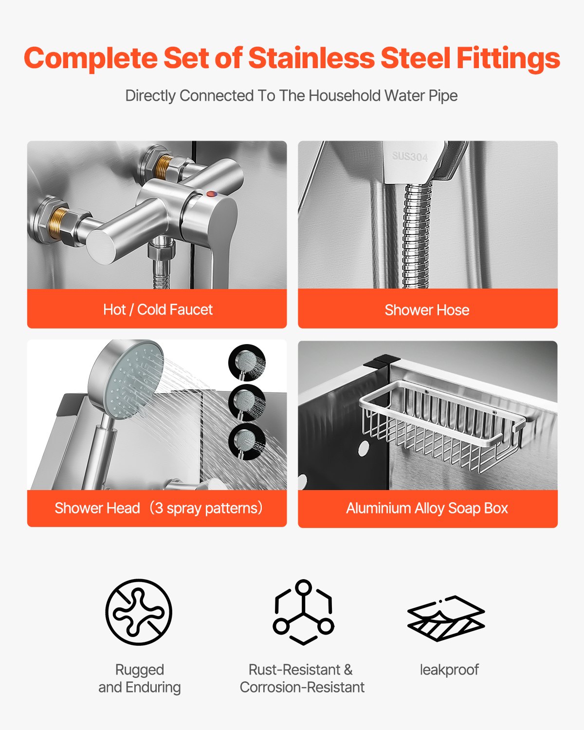 The pet washing sink includes a showerhead, faucet, and a direct connection to a home hose for durability. It also comes with cleaning cloths, a squeegee, play balls, a brush, and gloves, allowing your pet to fully enjoy their bath time