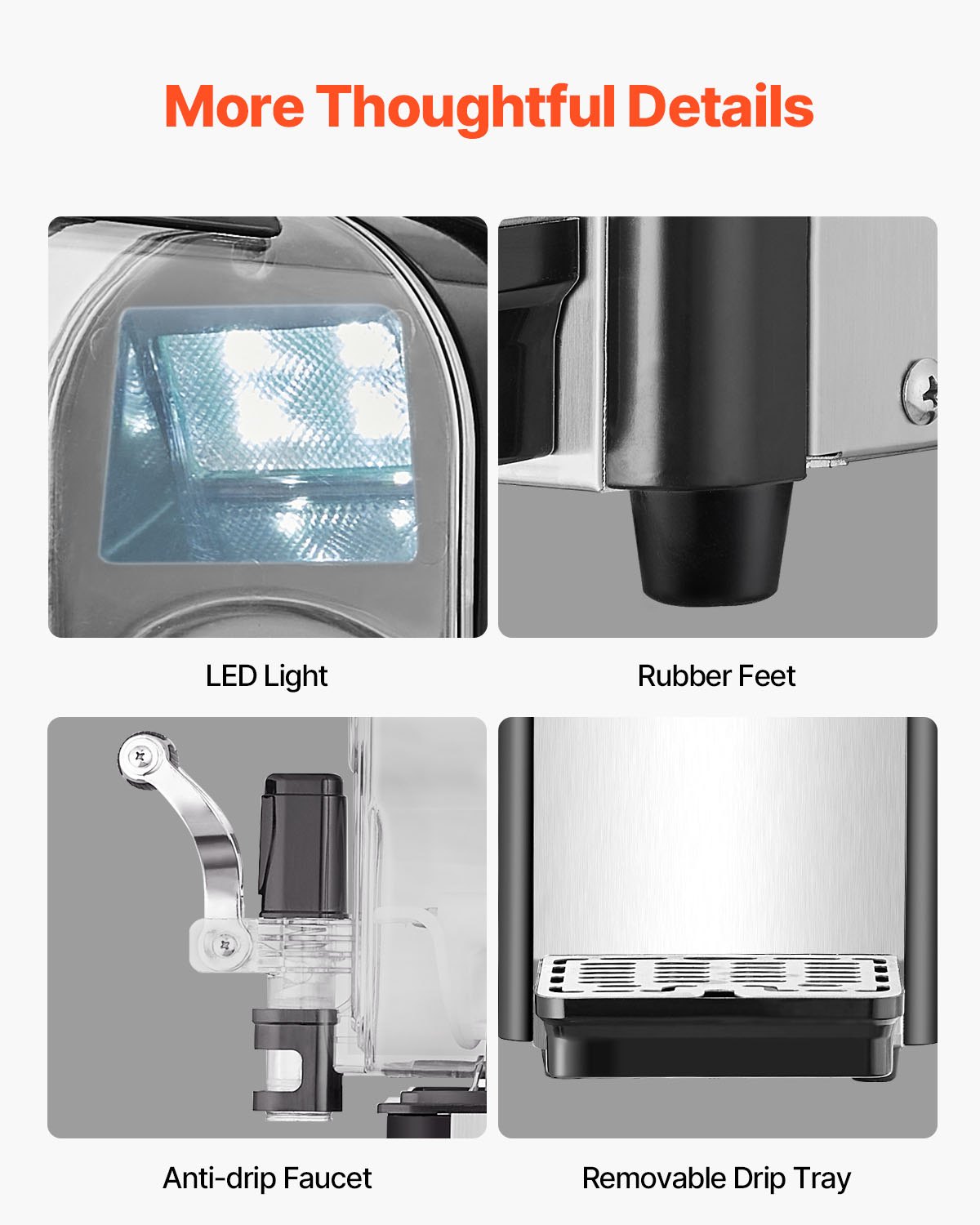 The slushy maker machine is equipped with a drip tray at the bottom to prevent water leakage, which can be removed for easy cleaning. The spring-loaded faucet ensures minimal water leakage after use. The three-sided ventilation design helps with quick heat dissipation, and the rubber feet provide non-slip stability during operation, ensuring better machine stability.