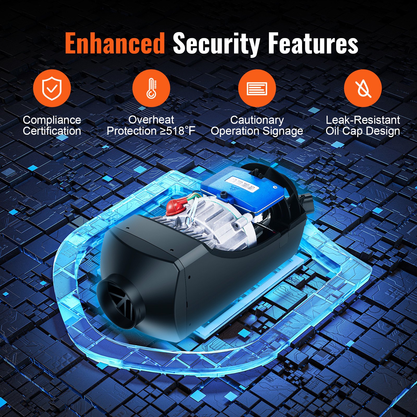 Our diesel parking heater features a high safety system, allowing for worry-free usage in various environments such as cars, RVs, ships, and indoors. It provides constant temperature control, timing function, voice broadcasting, preheating, and overheating protection at ��270��C/518��F, ensuring a secure and comfortable experience throughout the night.