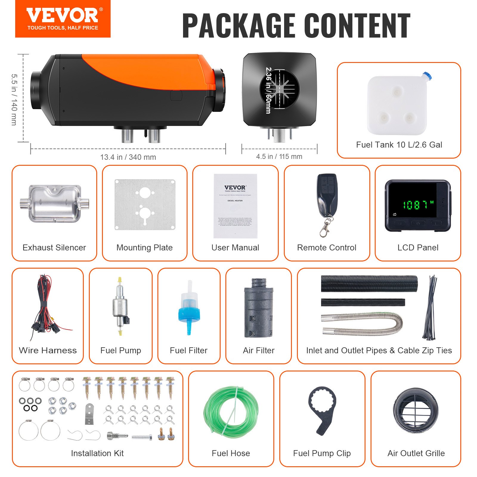 Heater Power: 2 KW; Rated Voltage: 12V & 24V. Applicable Range: 108-161 ft_/10-15m_. VEVOR diesel air heater adopts a sandblasting aluminum heat exchanger for rapid heat production and transfer, ensuring a comfortable temperature inside your vehicle, boat, or cabin within 10 minutes.