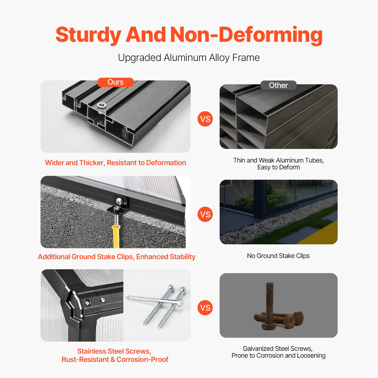 The backyard greenhouse is equipped with a thicker and stronger black aluminum frame, which is lightweight yet highly durable, with stainless steel screws for a longer service life and better resistance to harsh weather conditions.