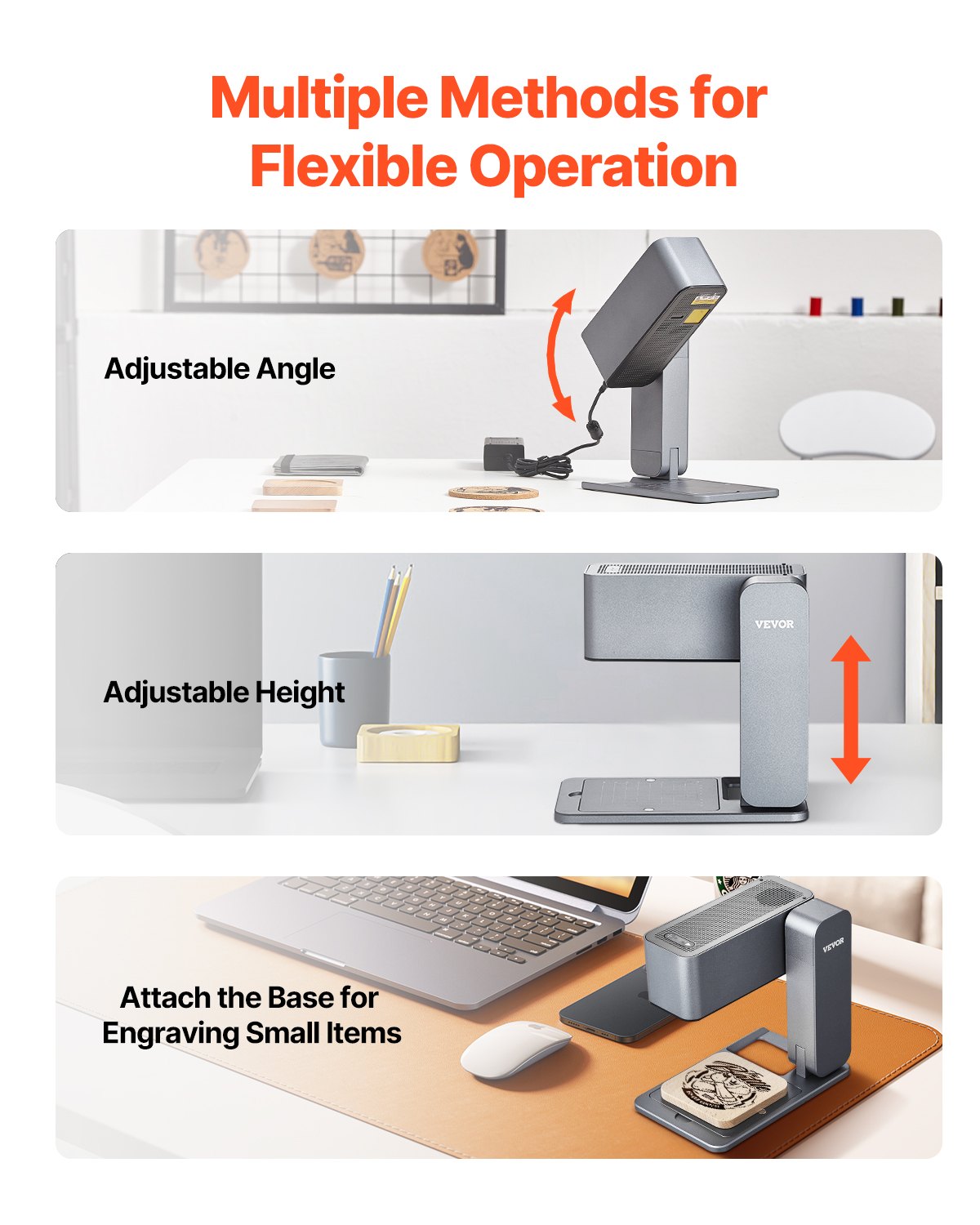 This high speed portable engraving machine allows adjustable angle and height. The base can be detached for engraving large objects, or attached for precise engraving of small items. Its versatility and convenience suit any engraving work.