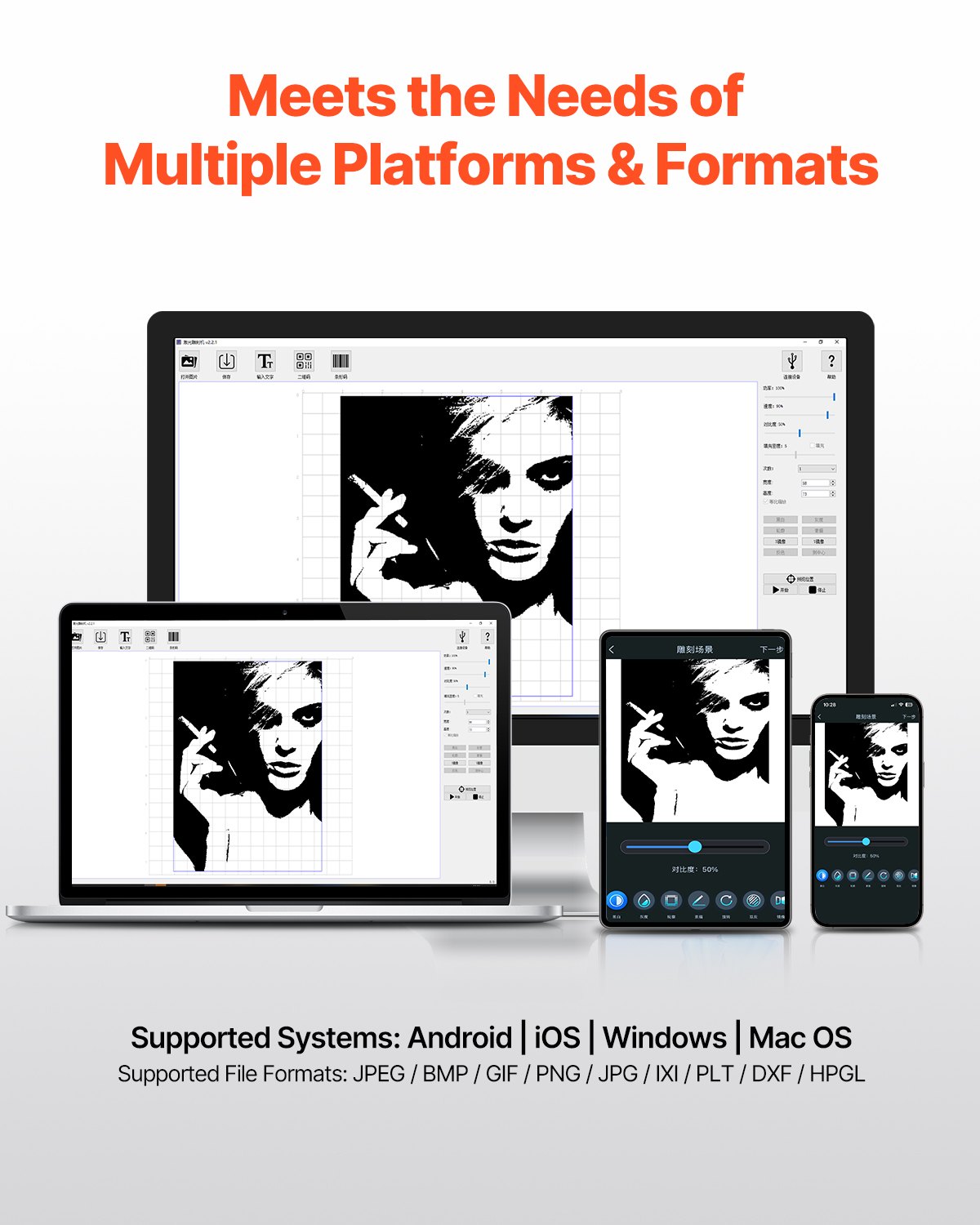 This portable engraving machine works with Android, iOS, Windows, and Mac OS. It supports various file formats, including JPEG, BMP, GIF, PNG, JPG, PLT, DXF, and HPGL, keeping flexibility for different users.