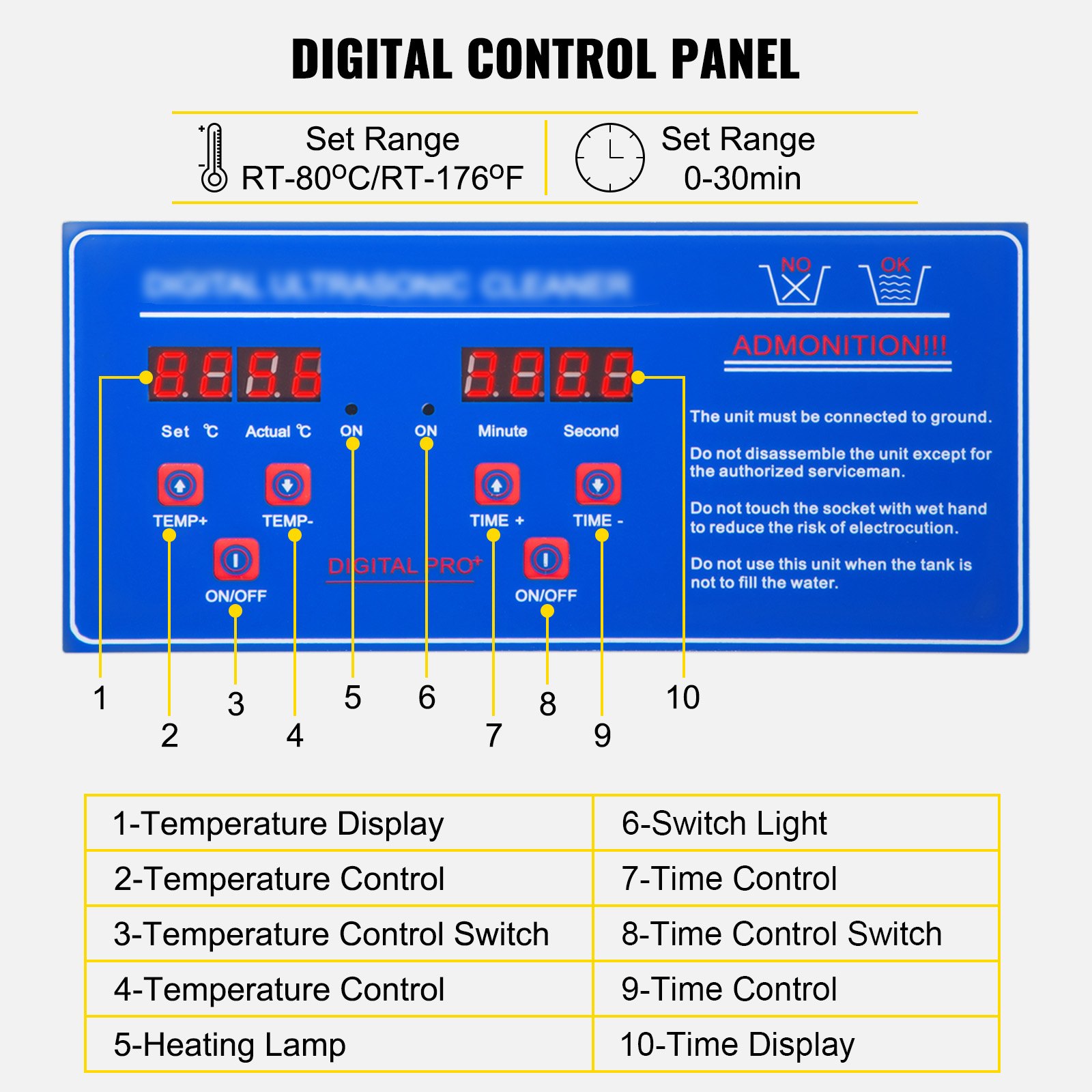 DIGITAL CONTROL PANEL – The jewelry cleaner ultrasonic machine features a digital control panel, with an adjustable timer (0-30 min) and heater (RT-176_/RT-80_) displayed on LED. A heating function can effectively soften and dissolve oil and wax stains, thereby improving the cleaning effect.