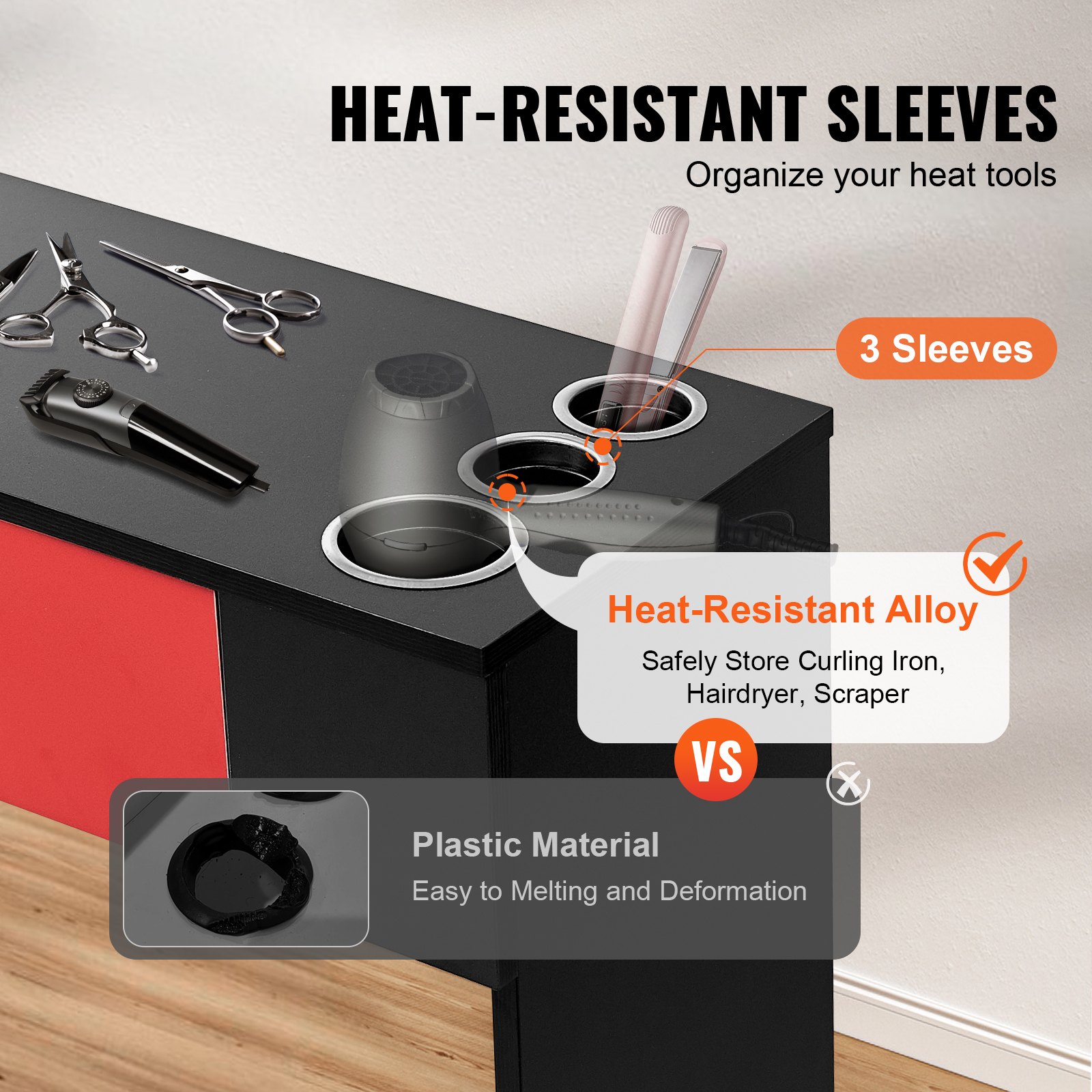 Made of heat-resistant alloy material, the hair styling salon station provides three heat tool sleeves with a bottom cover design to prevent tools from falling, ensuring safety during use.