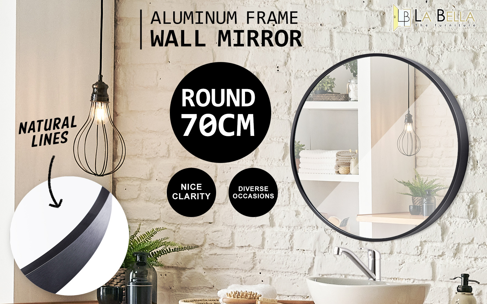 La Bella Wall Mirror Round Aluminum Frame Makeup Decor Bathroom Vanity 70cm – Black