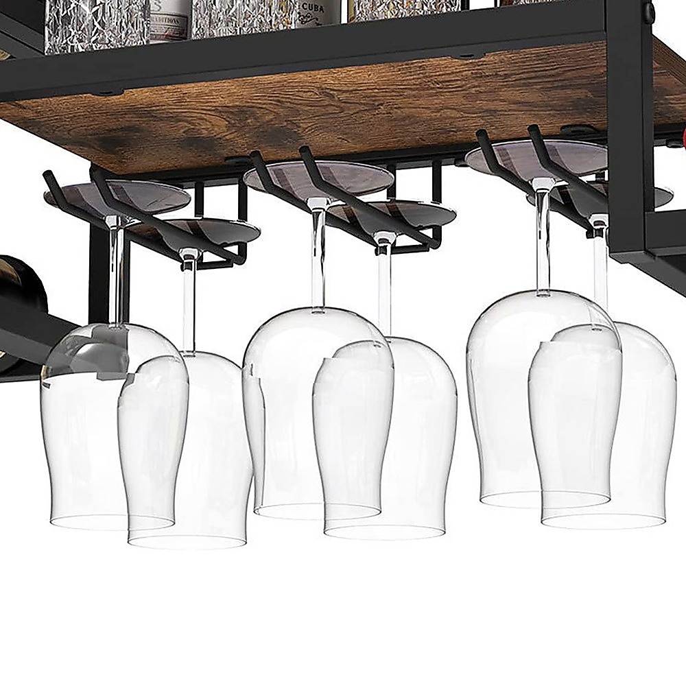 Introducing our versatile storage shelf that serves as a wine bottle holder and stemware rack, capable of accommodating up to 16 bottles of your favorite wine. It also features a hanging glass holder for added convenience. The top shelf offers additional storage space, perfect for displaying decorative items like plants, vases, and books.