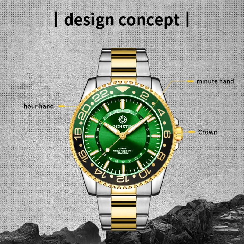 Waterproof Luminous Men Watch with Steel Strap – Multifunctional – Green + Gold