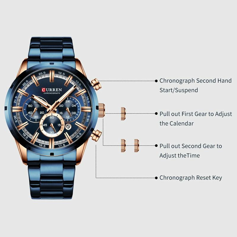 • 1 x M8355 Men Waterproof Quartz Six Stitches Calendar Steel Belt Business Watch