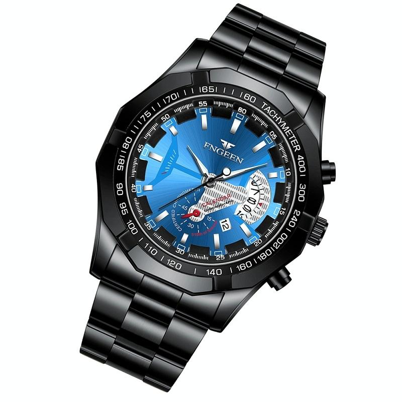 Waterproof Men Calendar Watch – Black Leather White Steel Blue Surface