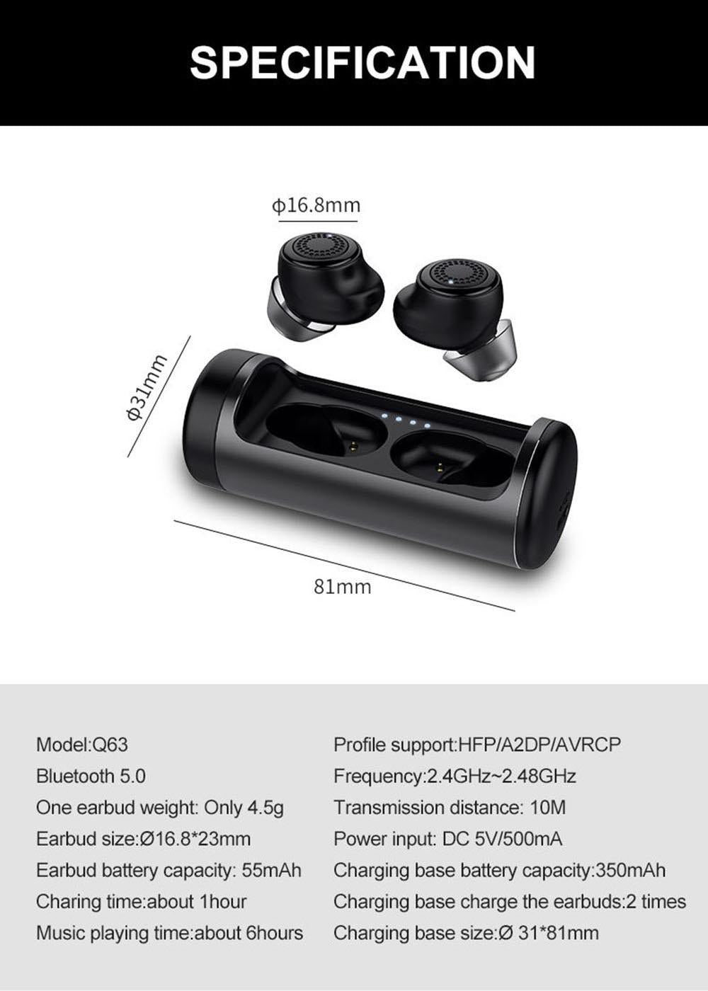 • 1 x Q63 Tws Wireless Bluetooth Waterproof Earbuds 3D Stereo Earphones With Charging Base Case