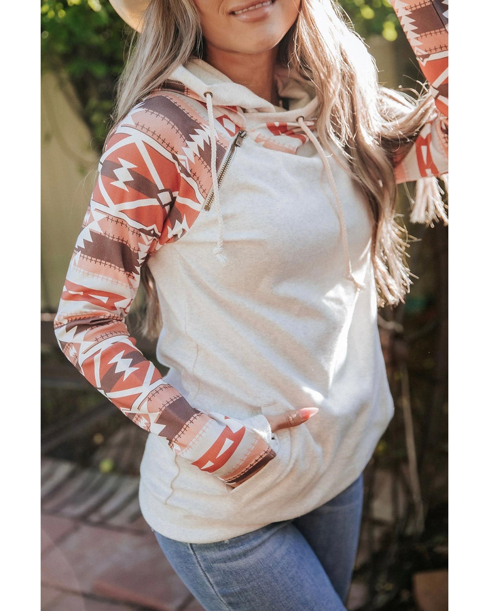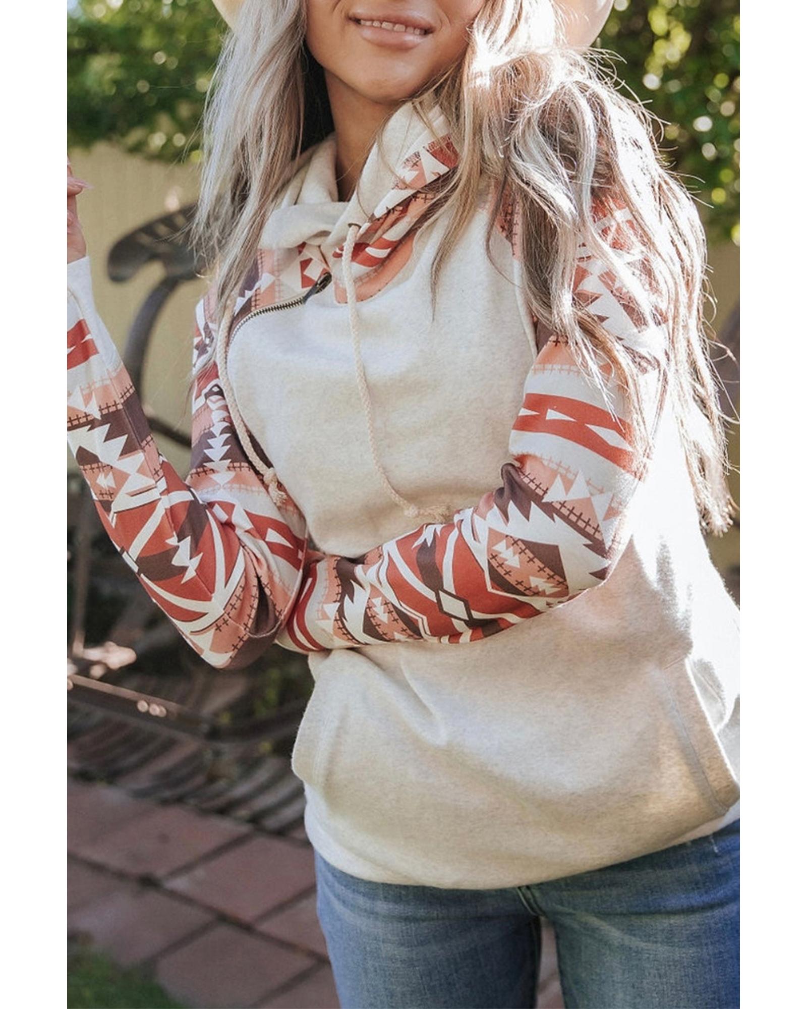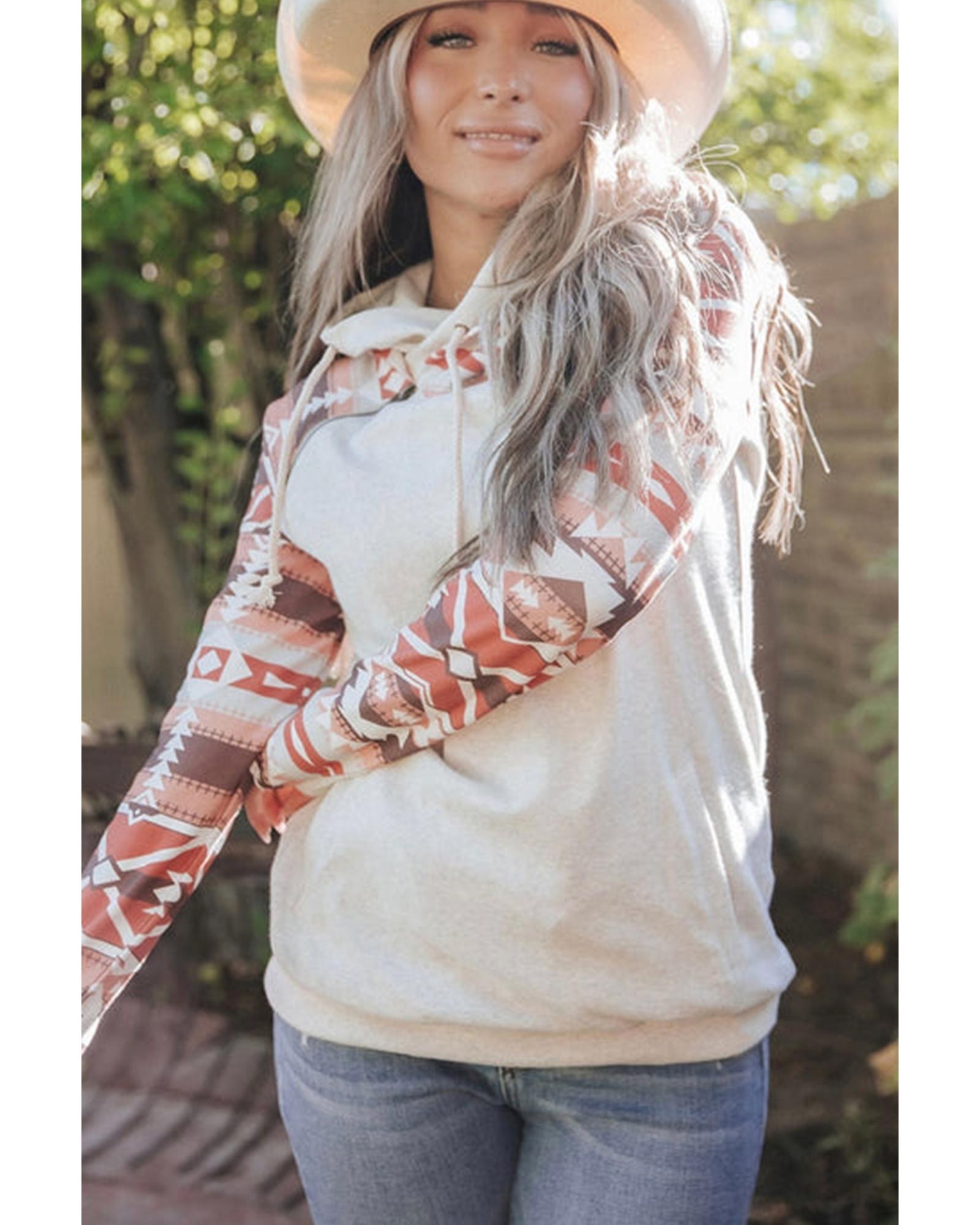 Western Aztec Print Patchwork Double Hood Hoodie – L