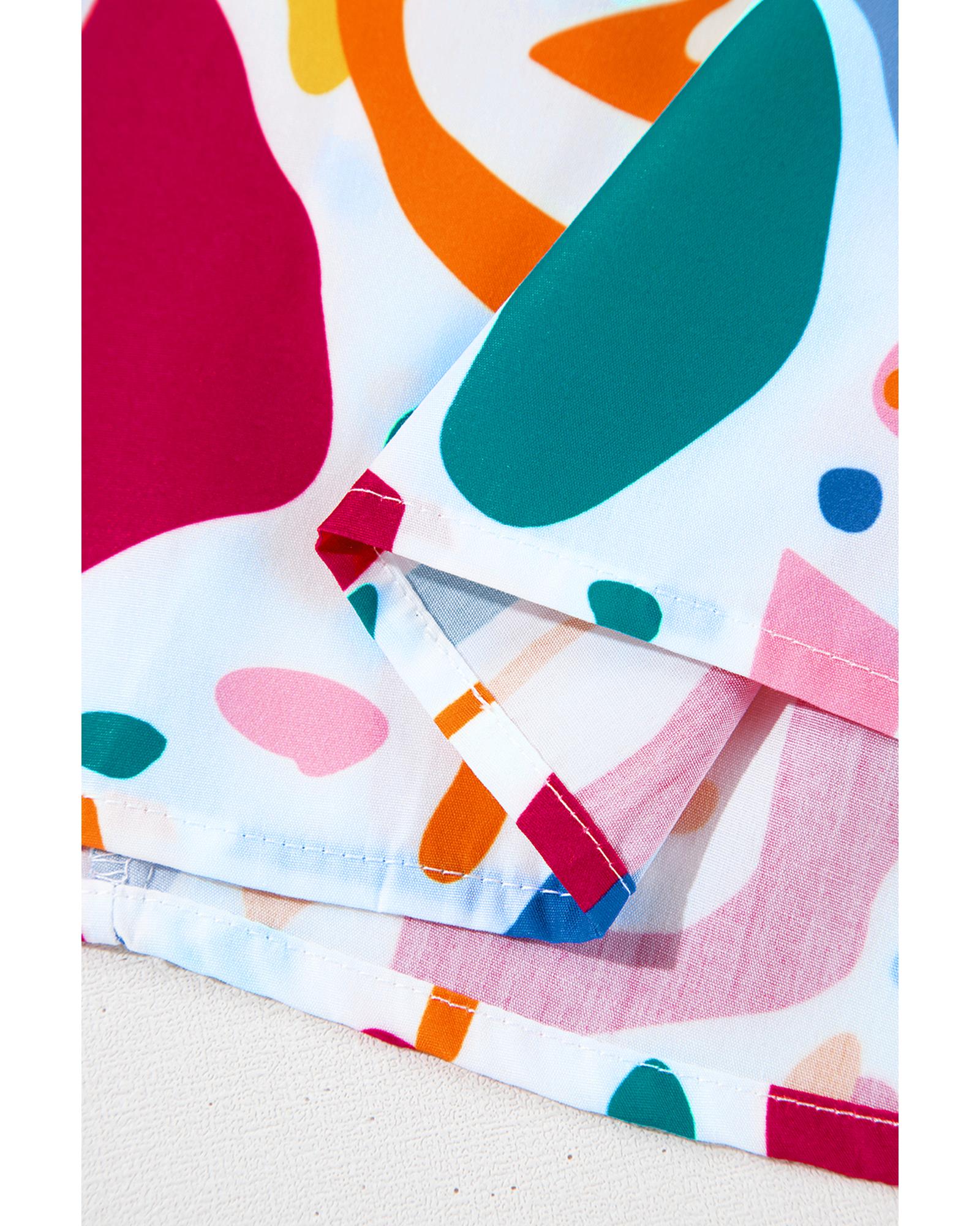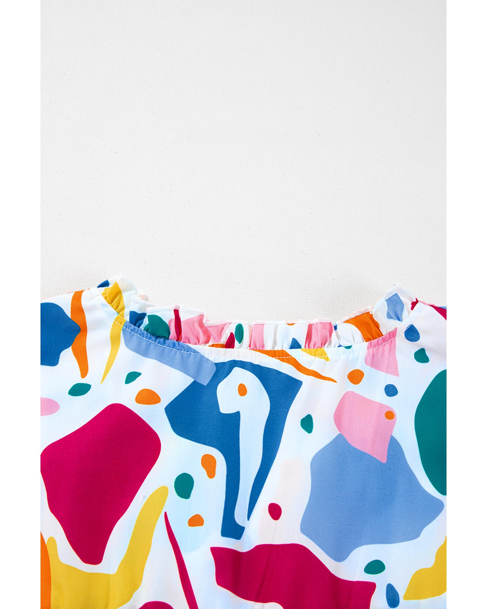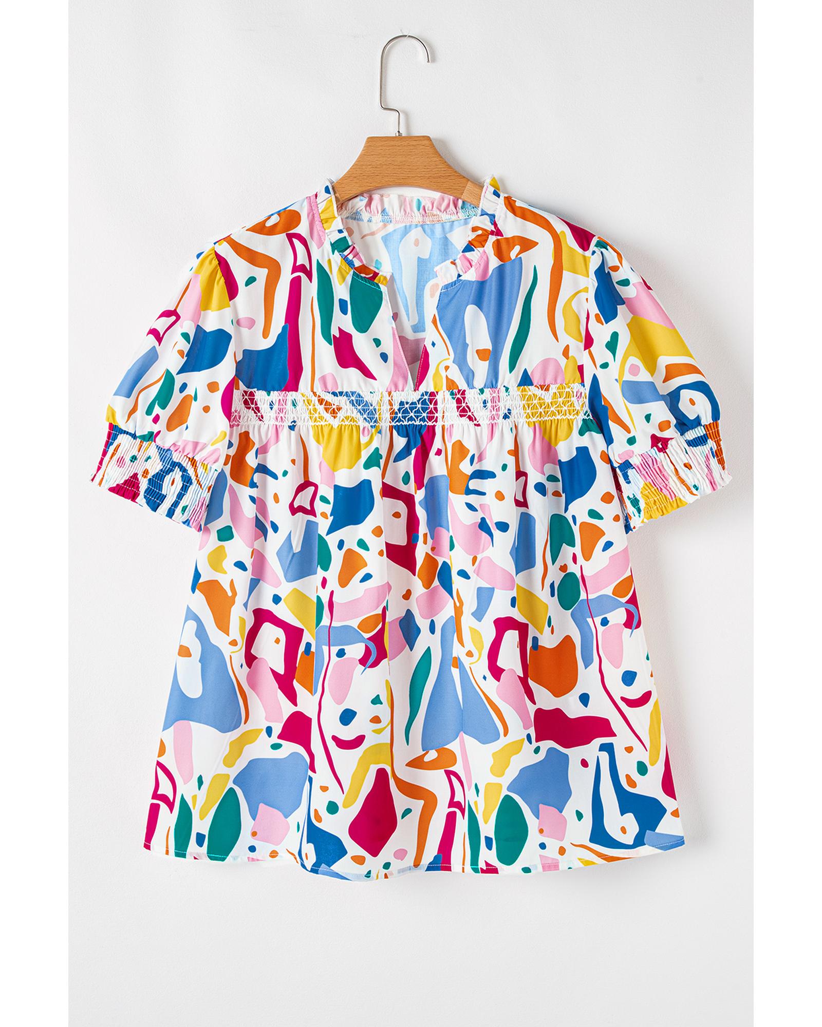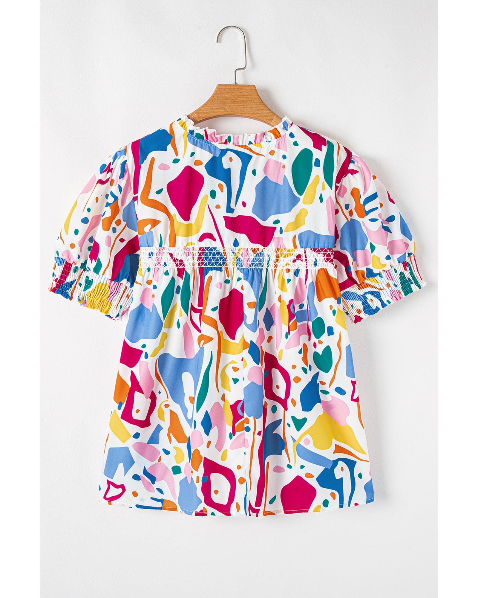 White Abstract Print Shirred Cuff Puff Sleeve Plus Size Blouse – 4X