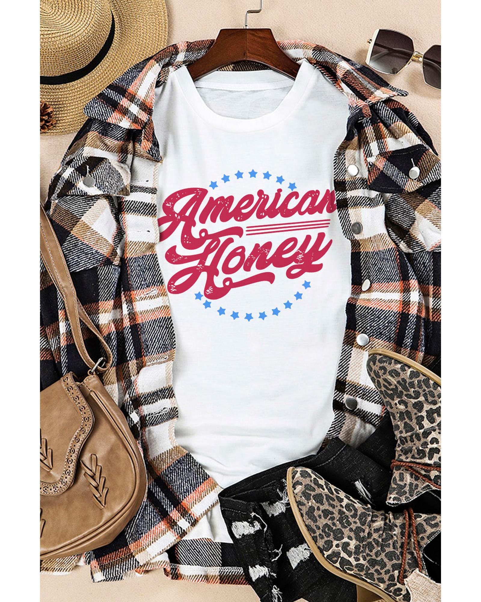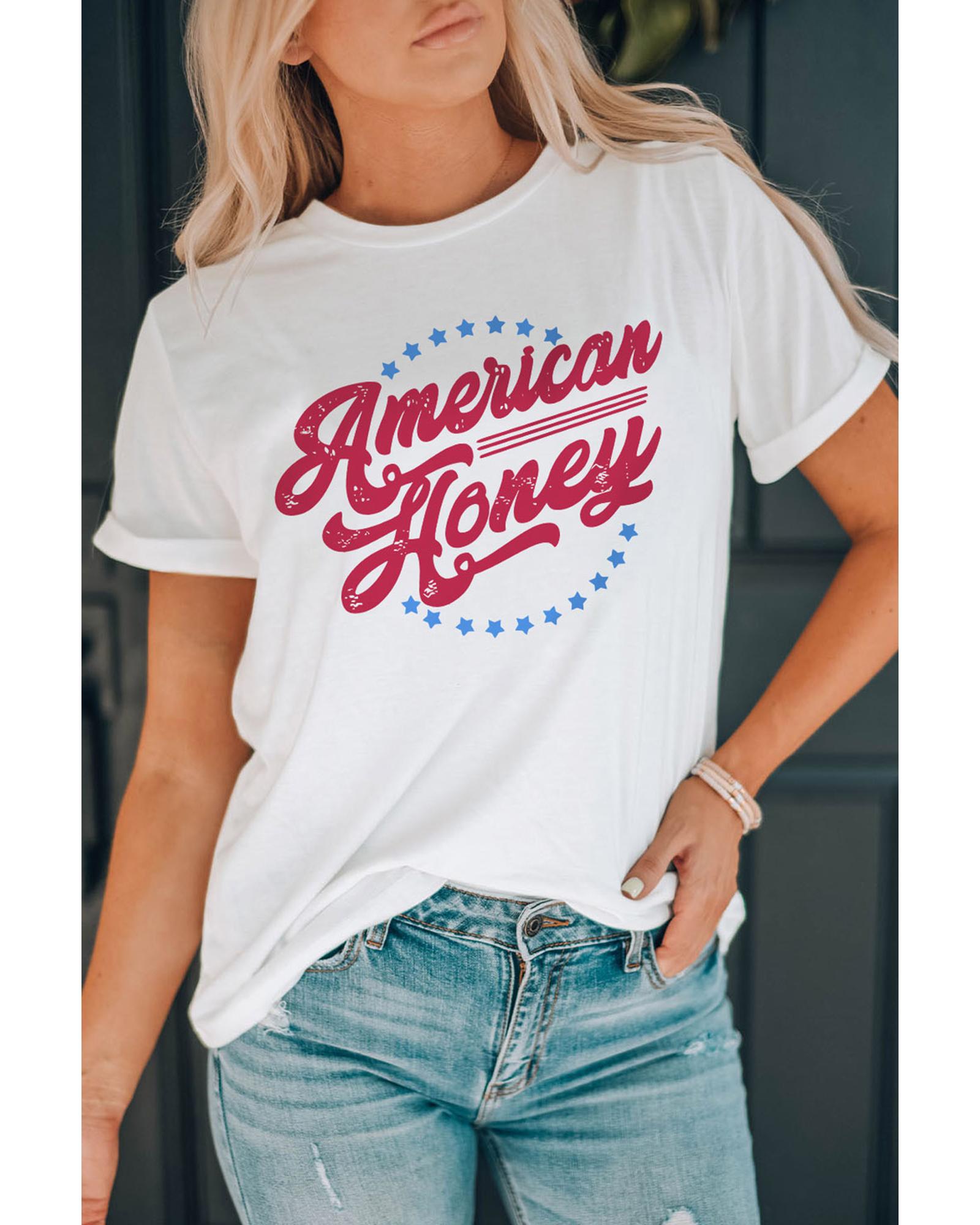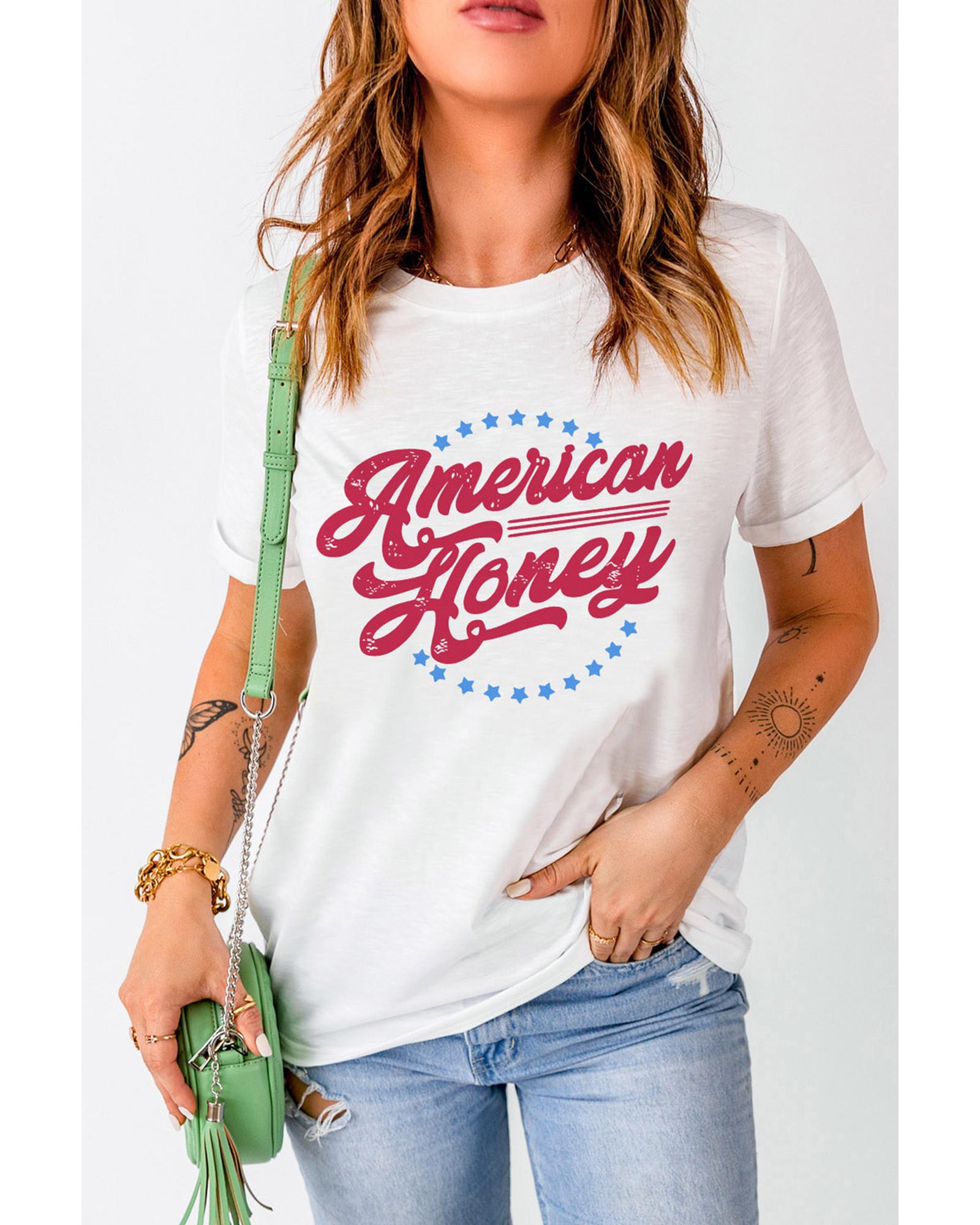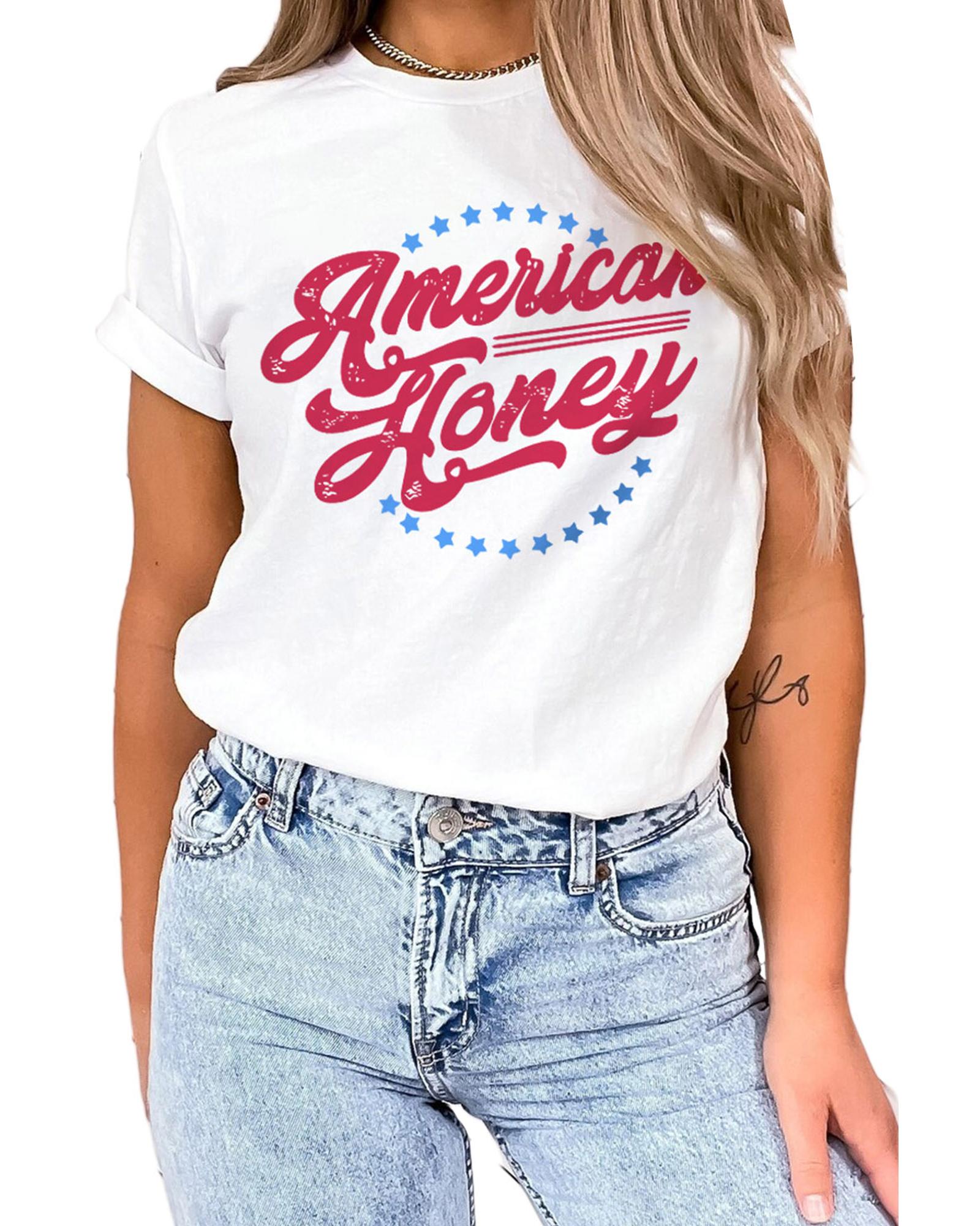 Stylish and trendy White American Honey Graphic Tee Short sleeve design with American Honey Stars print Made with high - quality materials Available in multiple sizes Refer to size chart for accurate measurements Perfect addition to your luxury fashion collection
