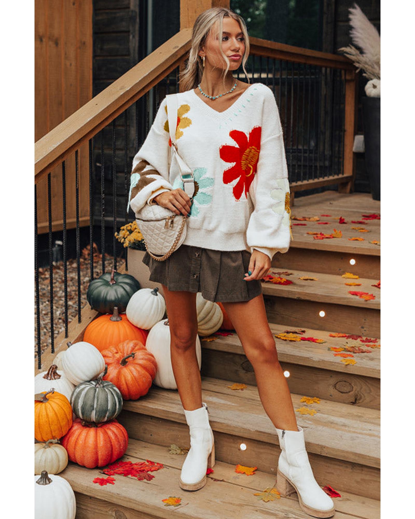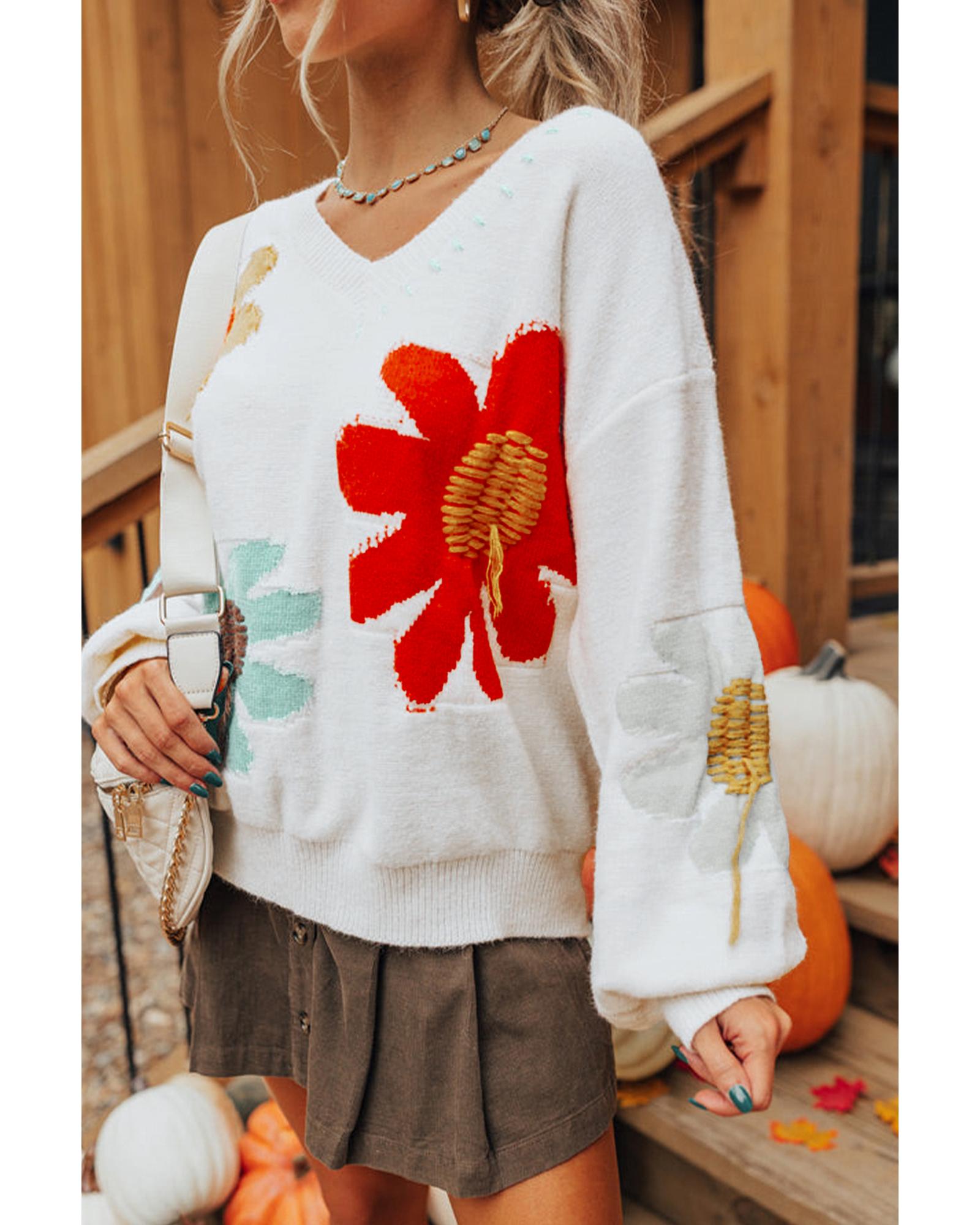 White Big Flower Pattern V Neck Drop Shoulder Sweater – S
