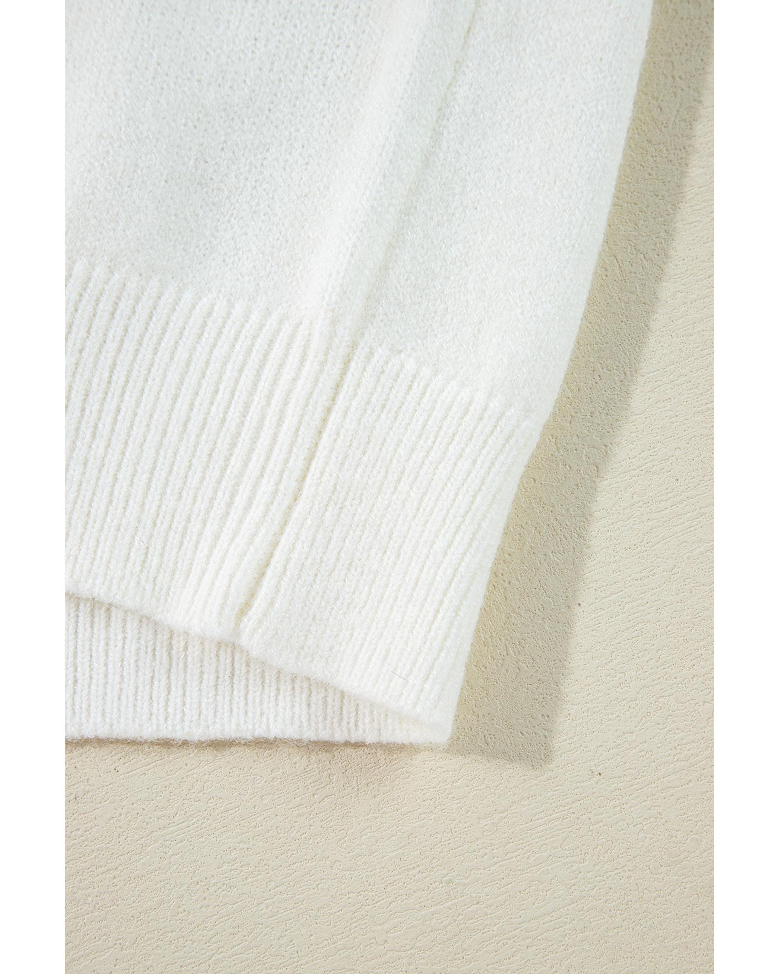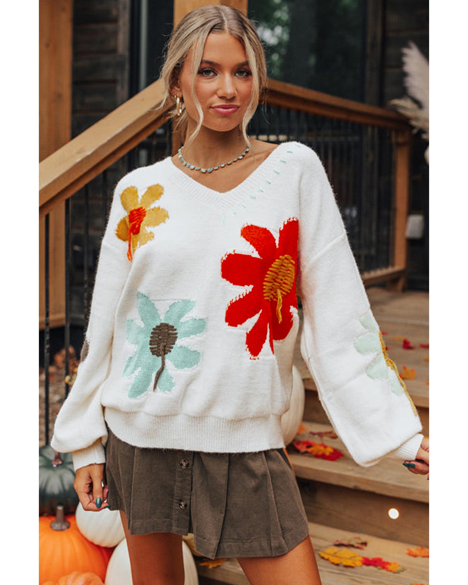 - White Big Flower Pattern V Neck Drop Shoulder Sweater