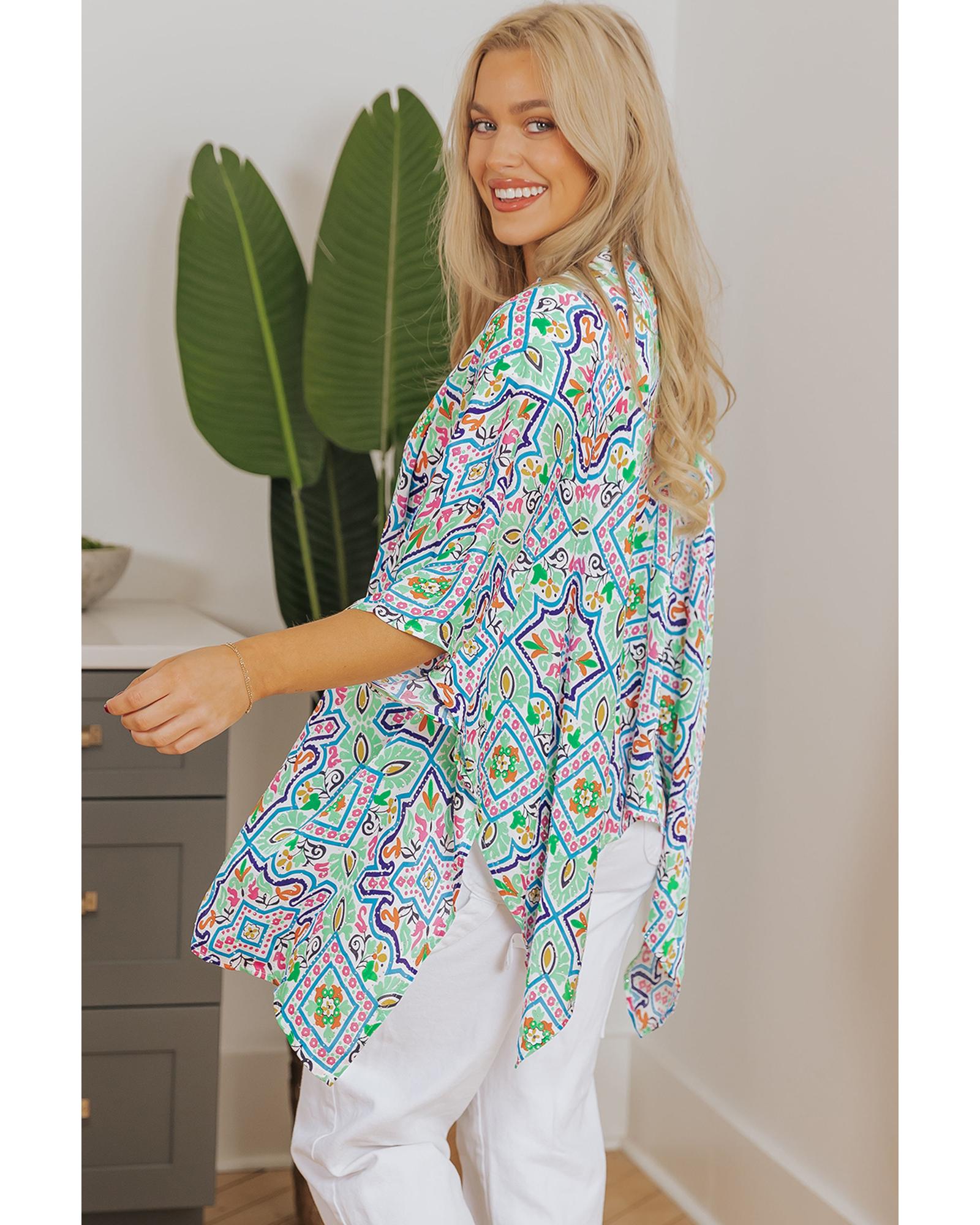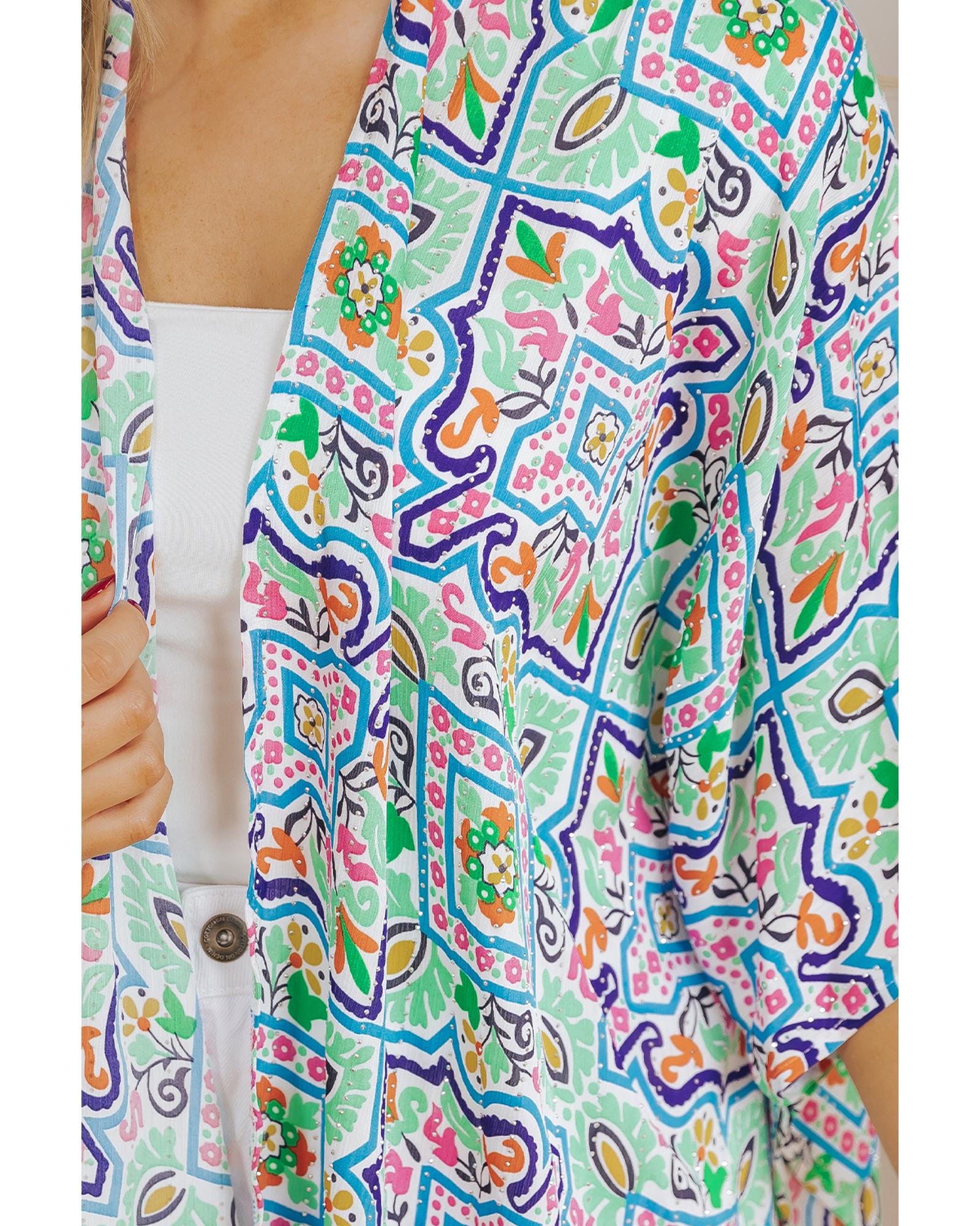White Boho Floral Printed Rhinestone 3/4 Sleeve Open Front Kimono – L