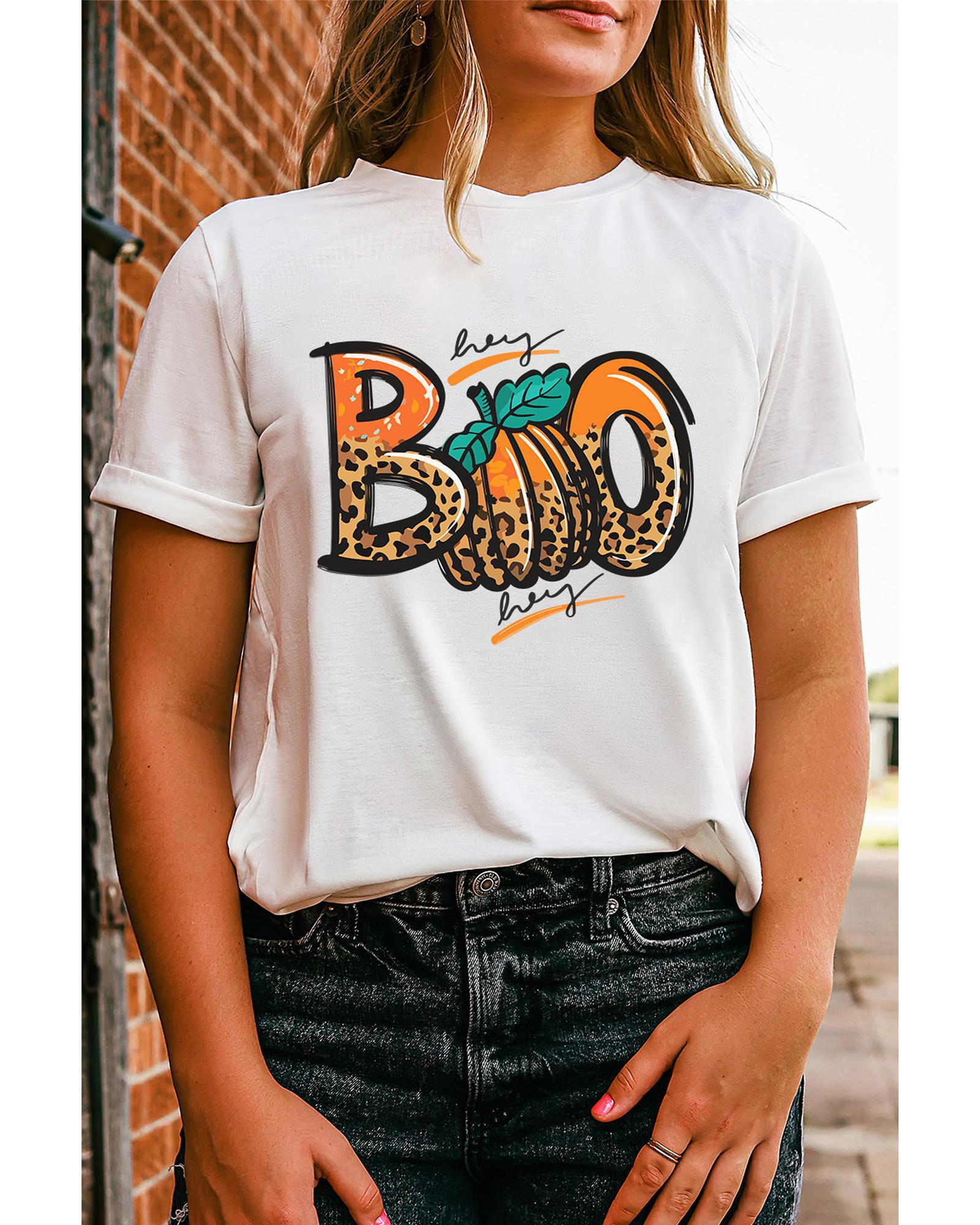 Stylish and trendy white t - shirt for women Crew neck design with a unique leopard print pattern Features a BOO pumpkin graphic Made with high