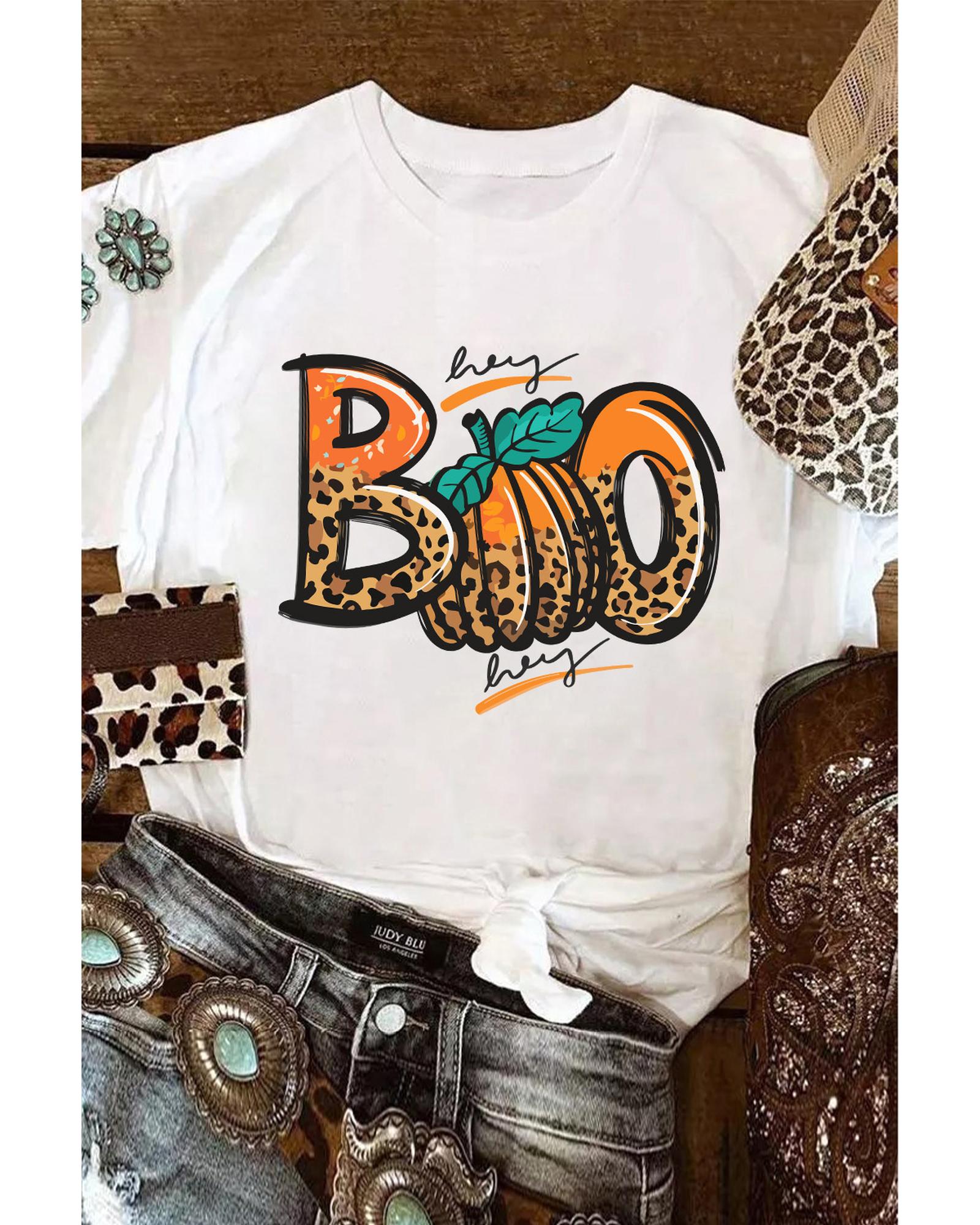 Stylish and trendy white t - shirt for women Crew neck design with a unique leopard print pattern Features a BOO pumpkin graphic Made with high
