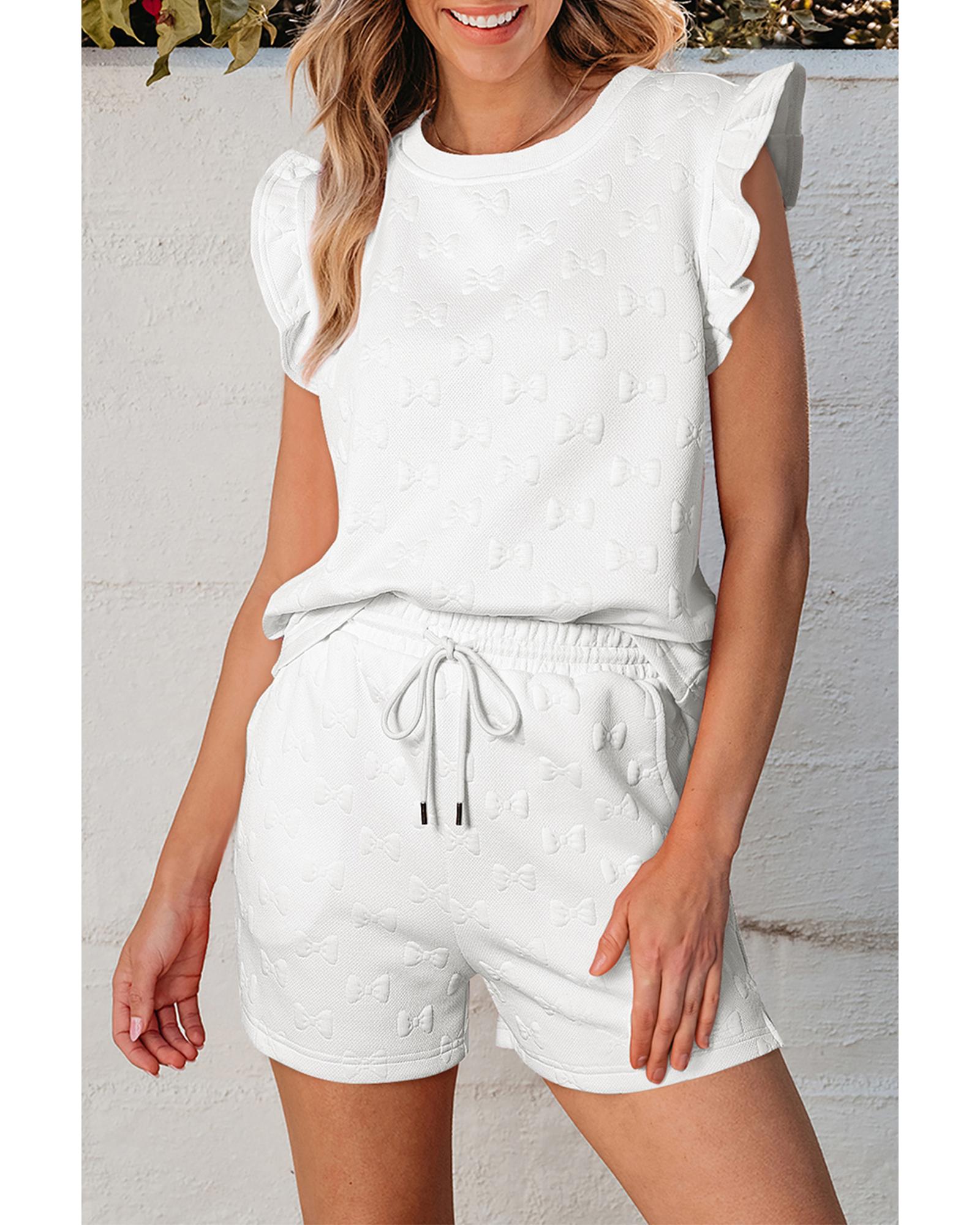 White Bow Jacquard Ruffle Sleeve Short 2pcs Outfit – S