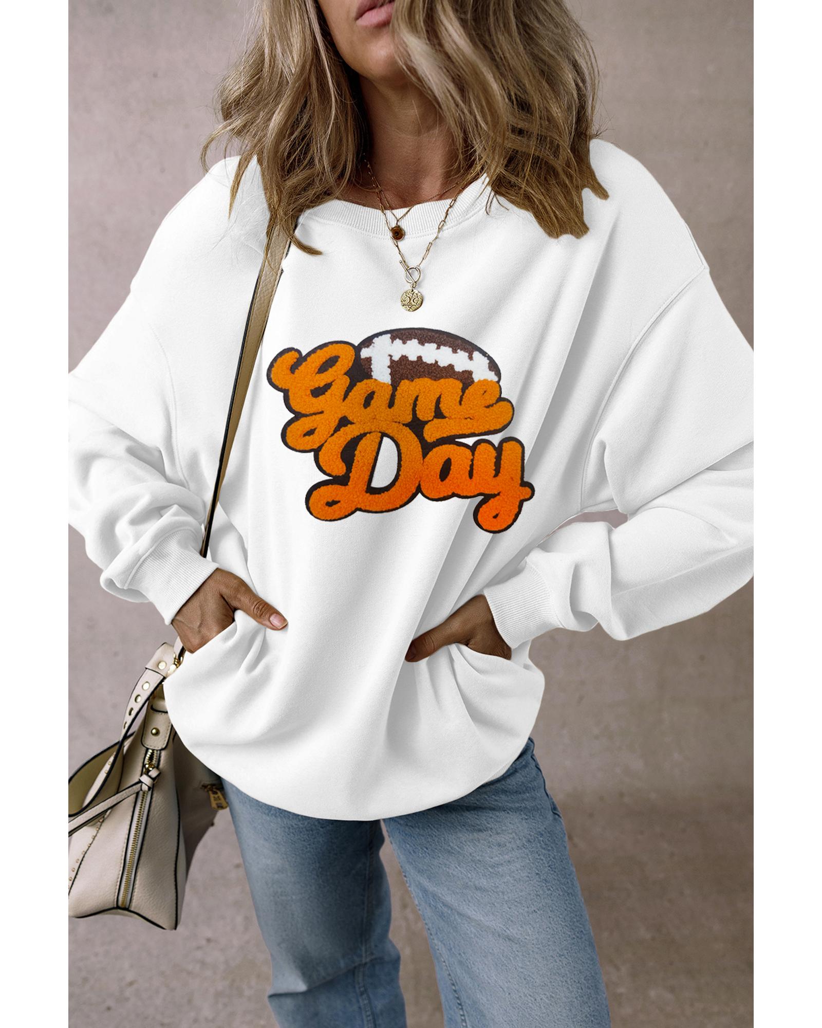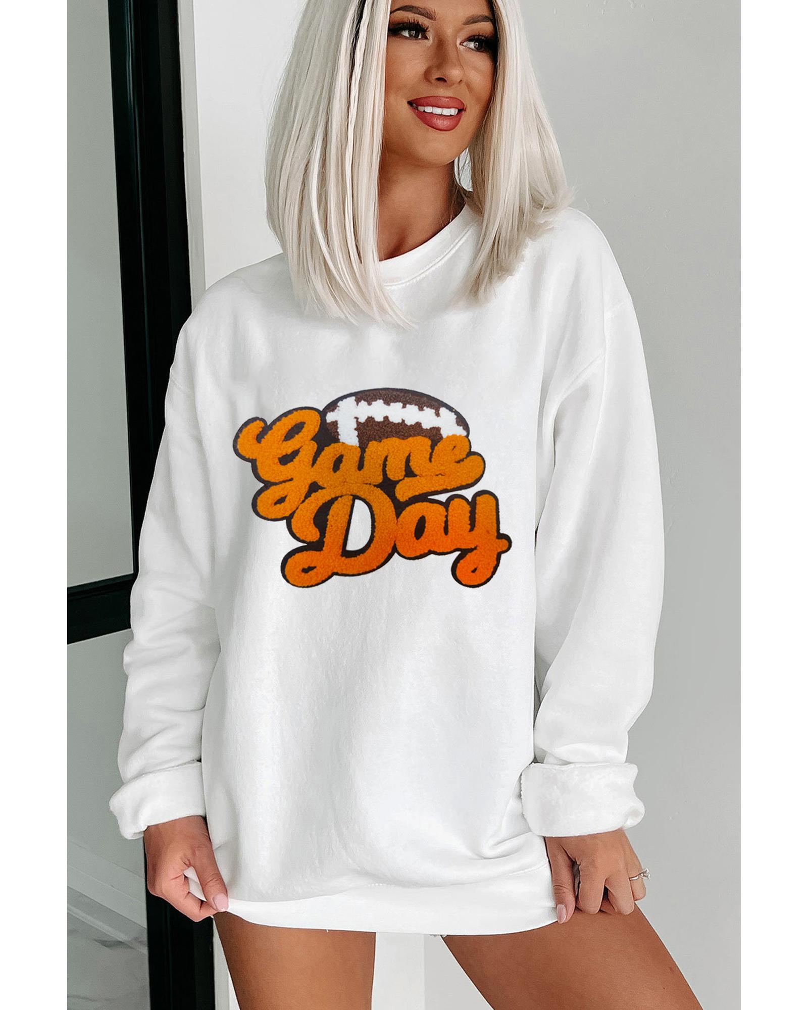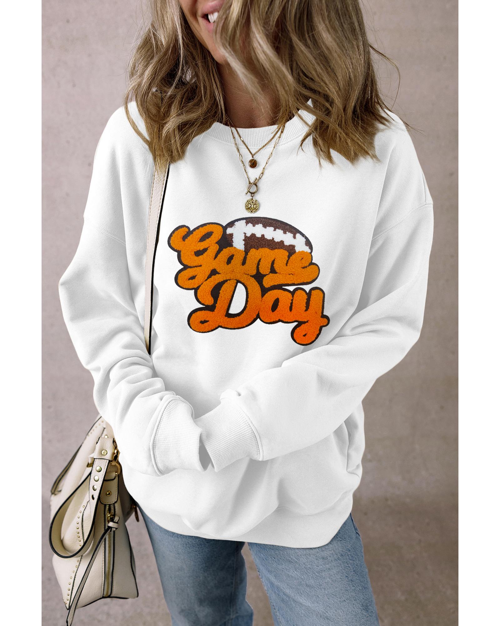 White Chenille Game Day Rugby Football Pattern Pullover Sweatshirt – L
