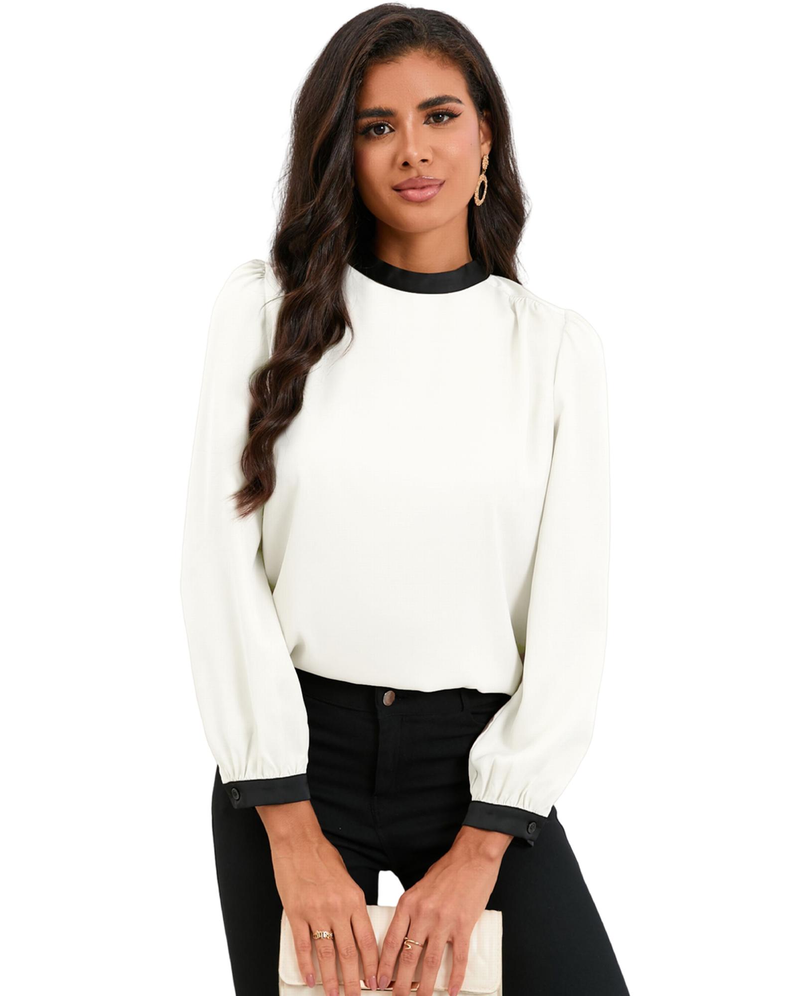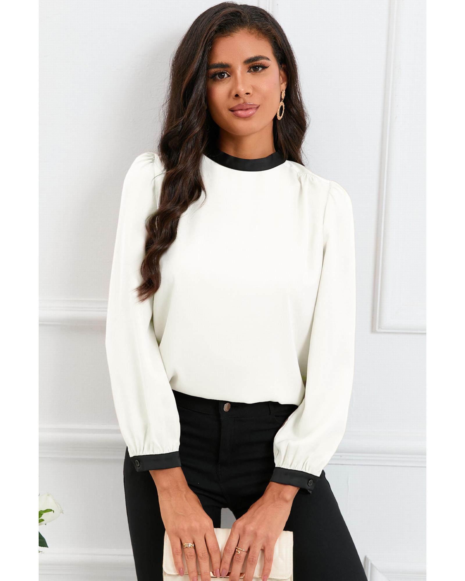 White Color Block Bow Back Mock Neck Blouse – L