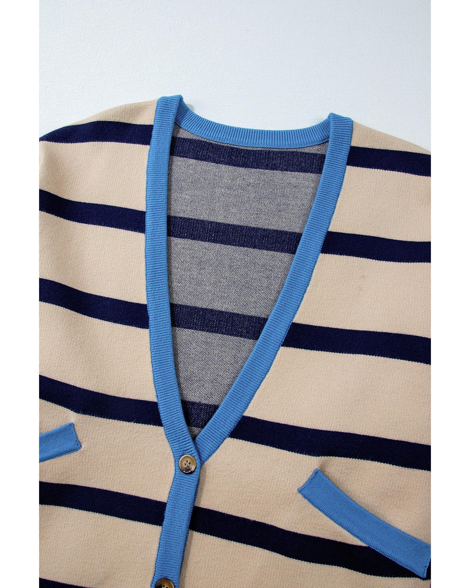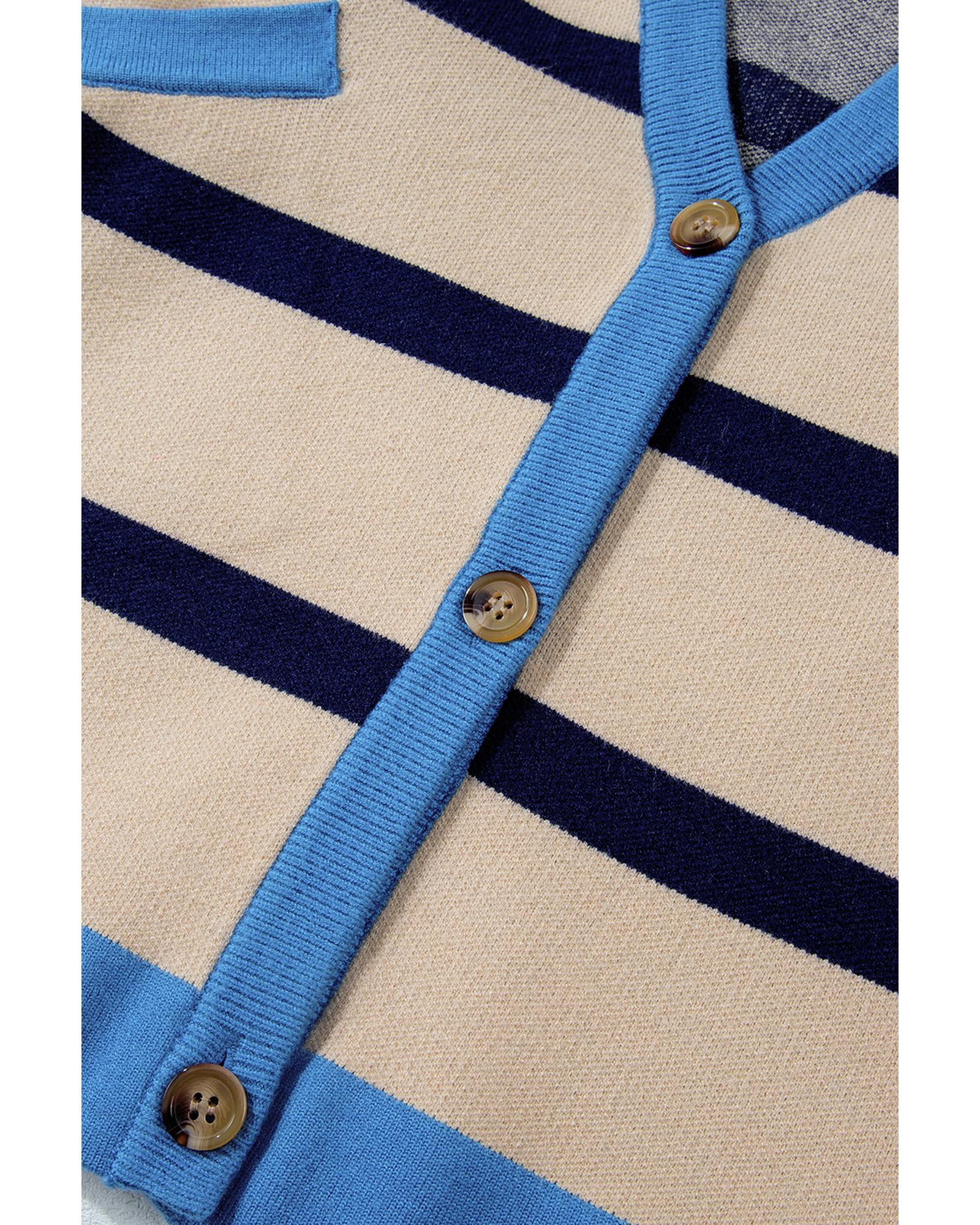 Blue Striped Color Block Hollowed Knit Cardigan - 2XL