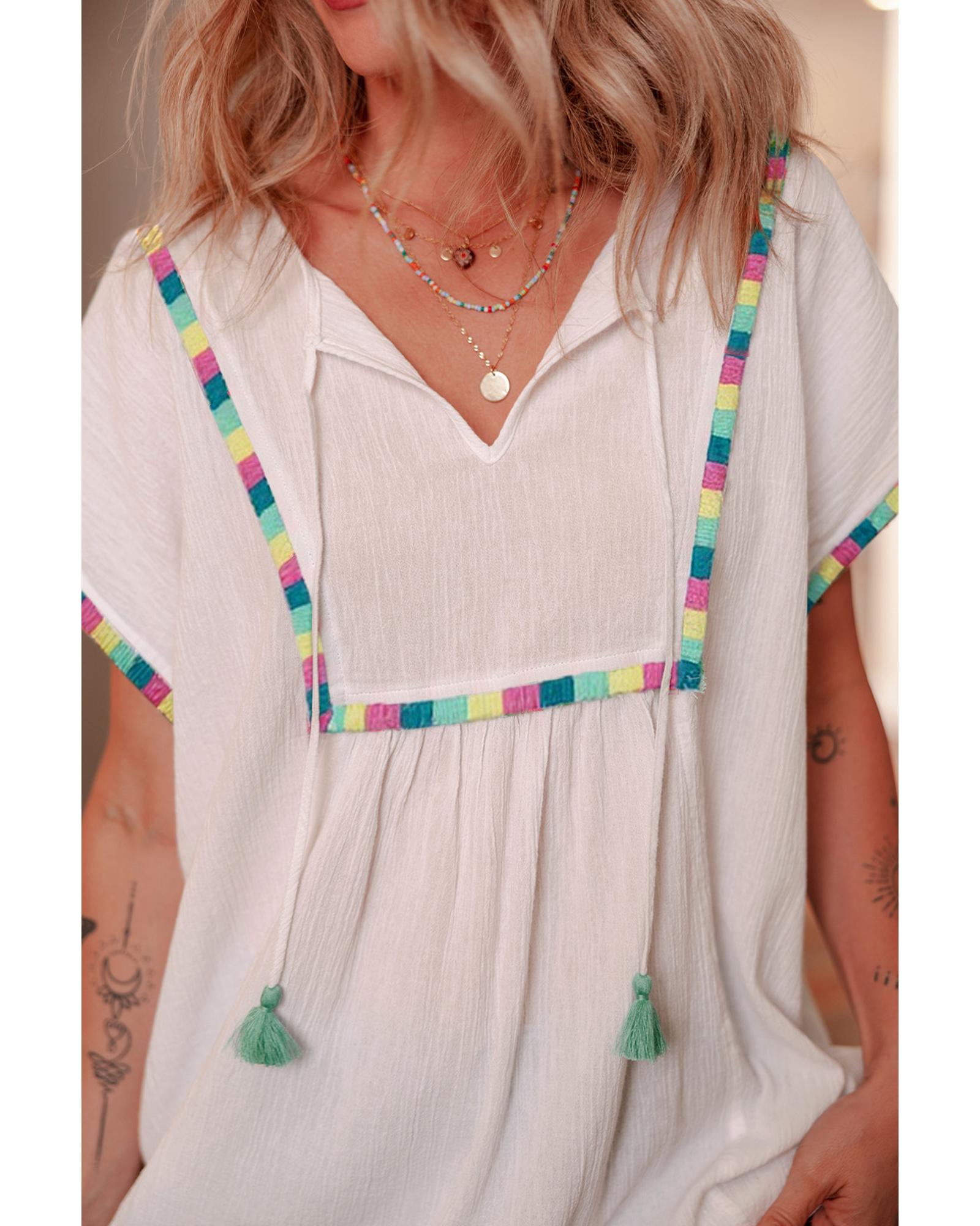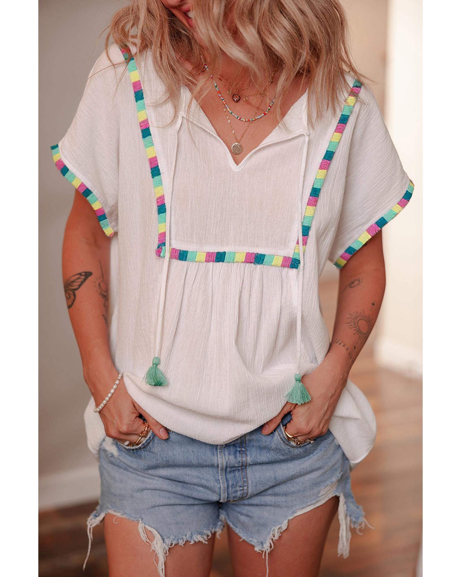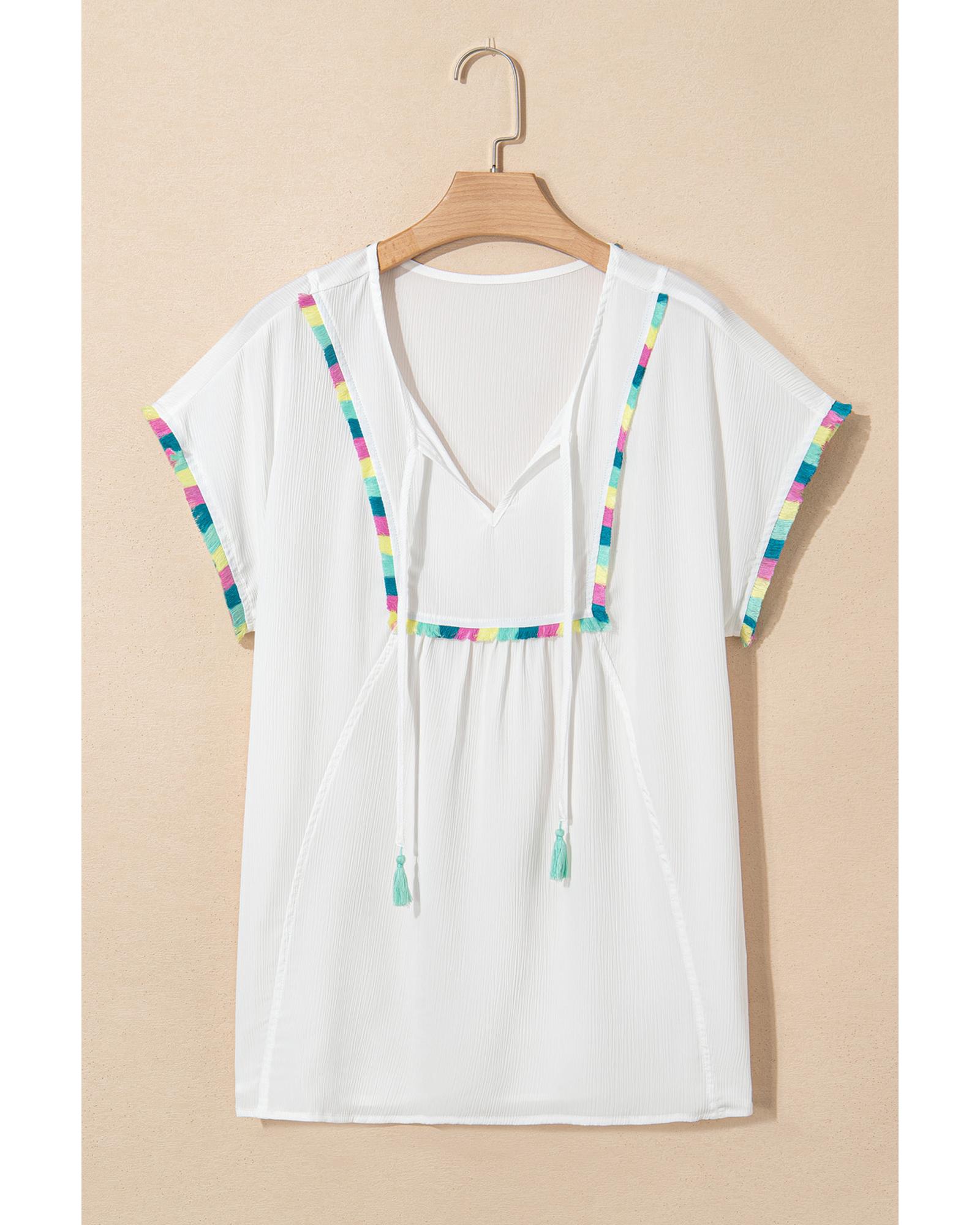 White Colorful Fringed Detail Tassel Tie Neck Short Sleeve Blouse – L