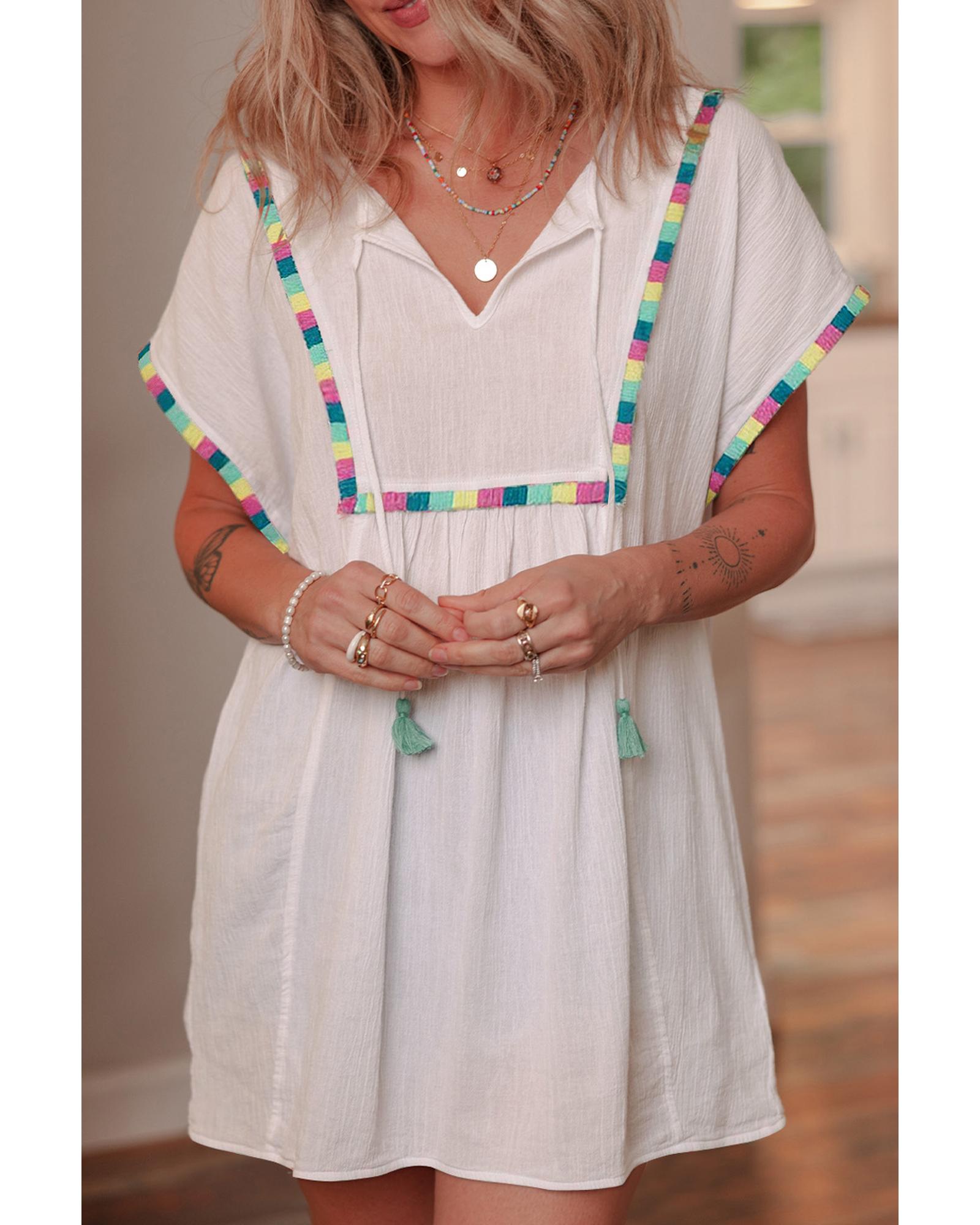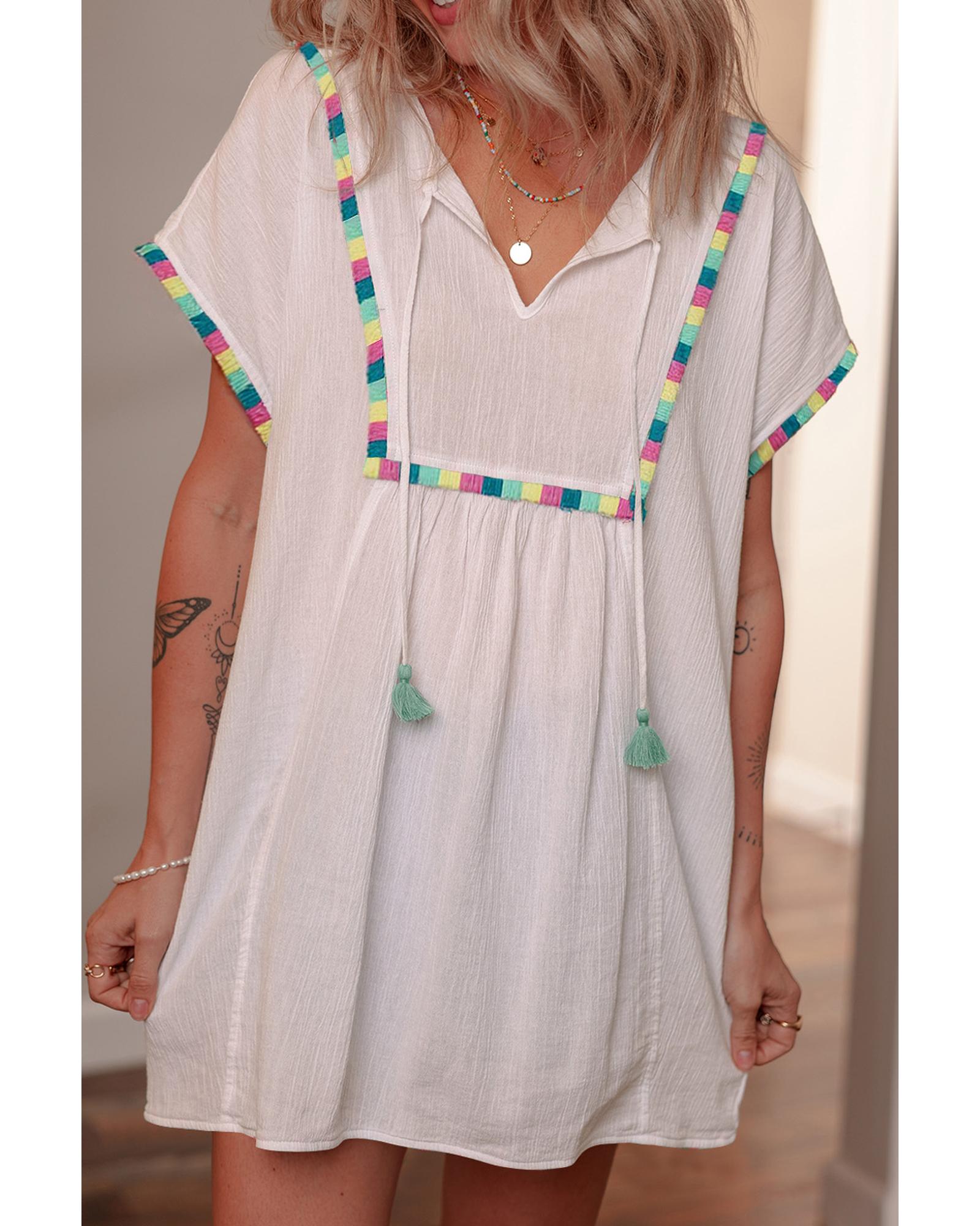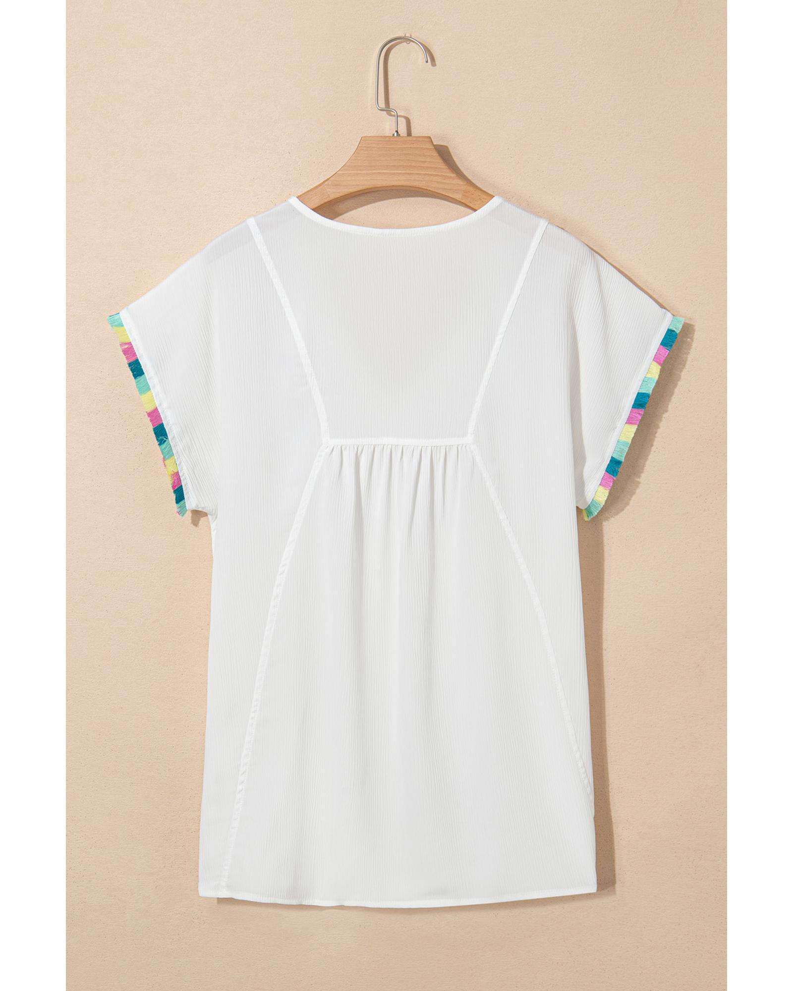 White Colorful Fringed Detail Tassel Tie Neck Short Sleeve Blouse – L