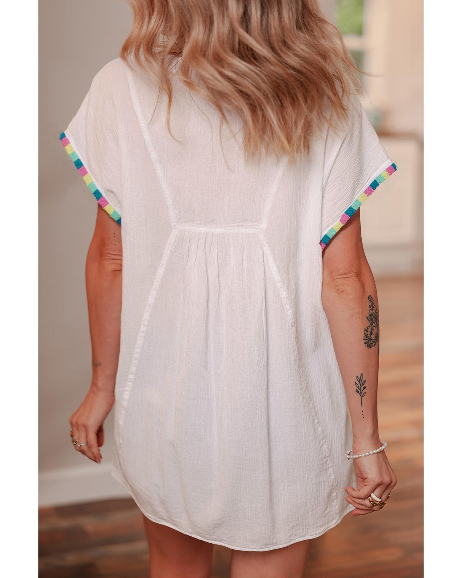White Colorful Fringed Detail Tassel Tie Neck Short Sleeve Blouse – XL