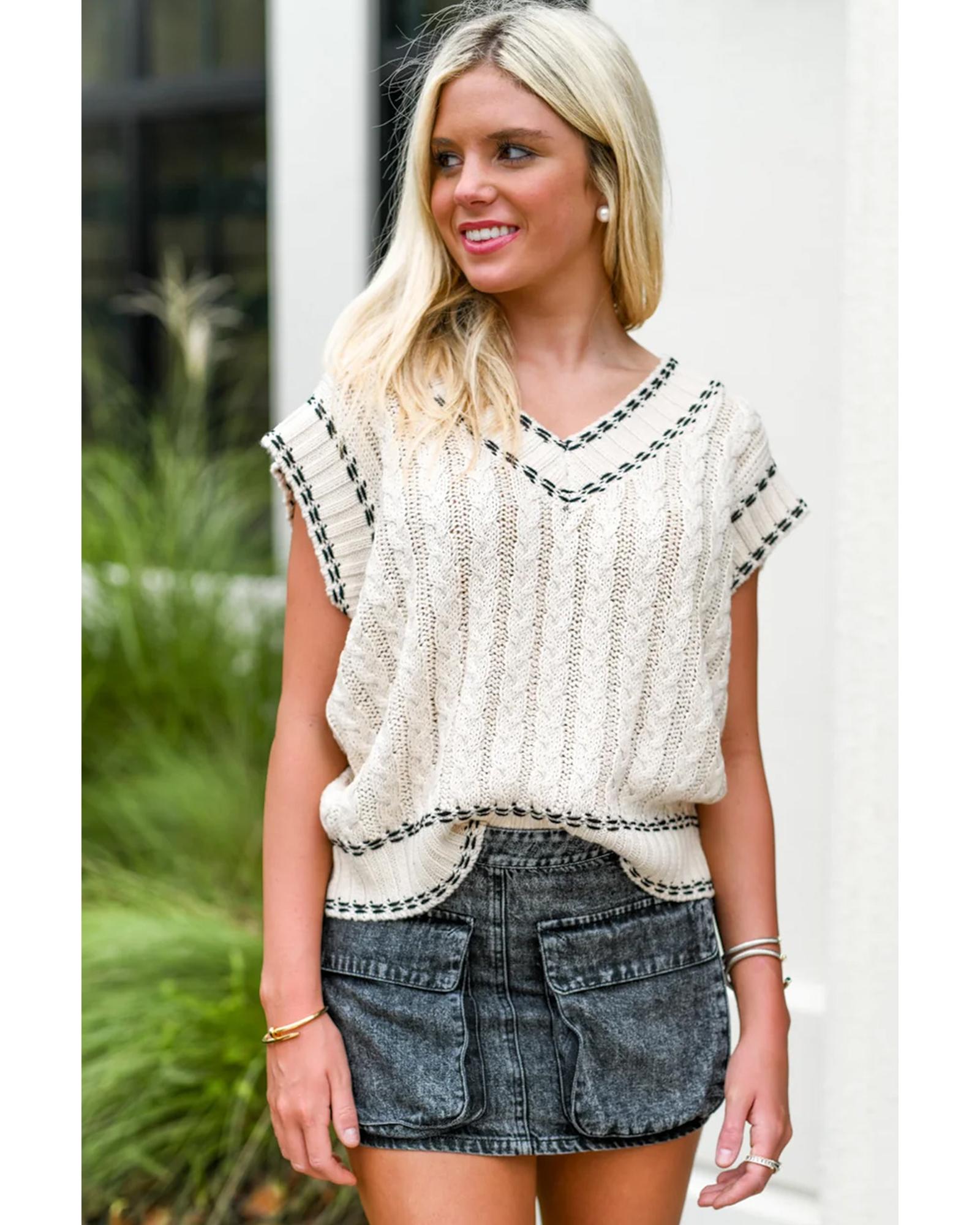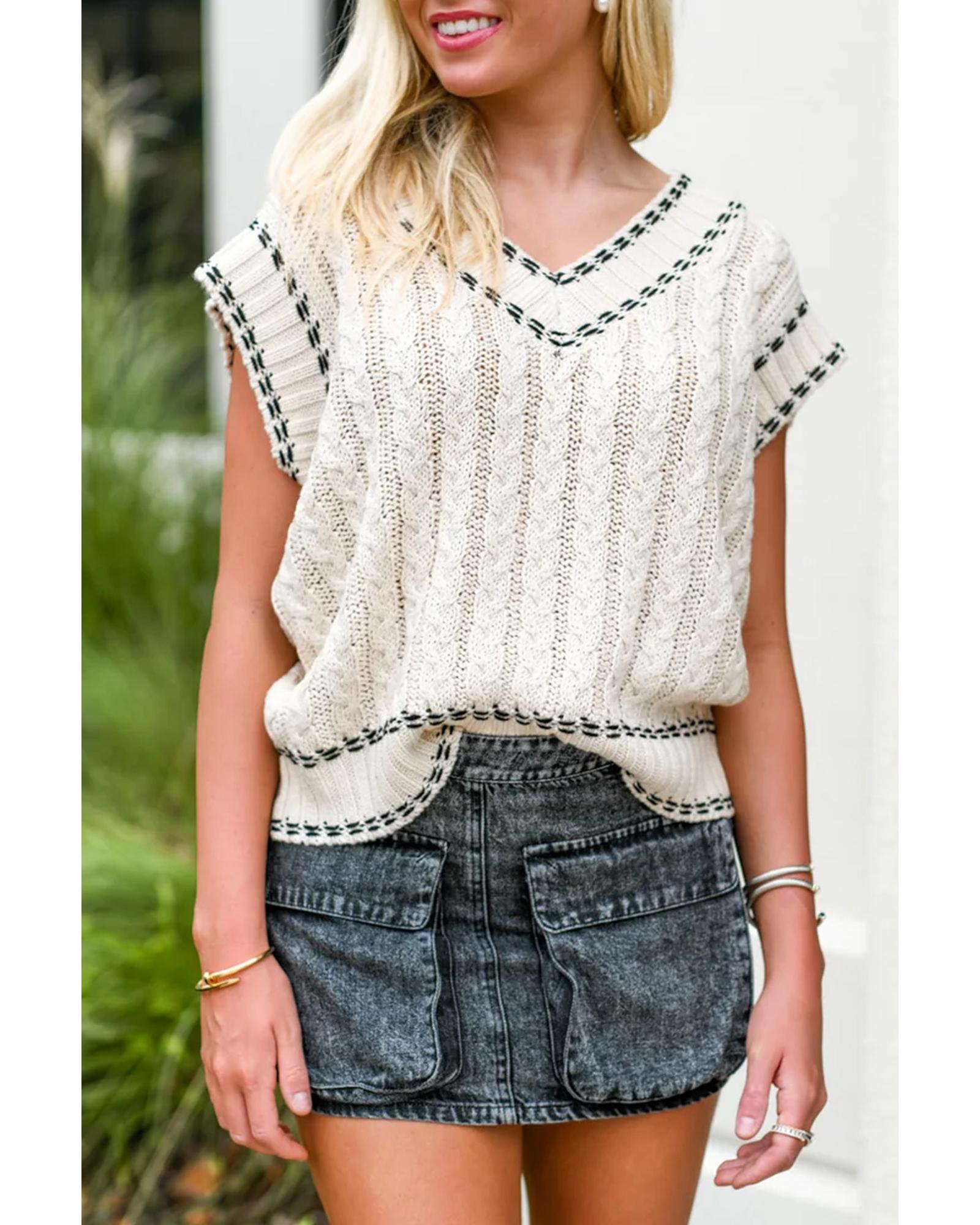 White Contrast Trim V Neck Cable Knit Sweater Vest – L