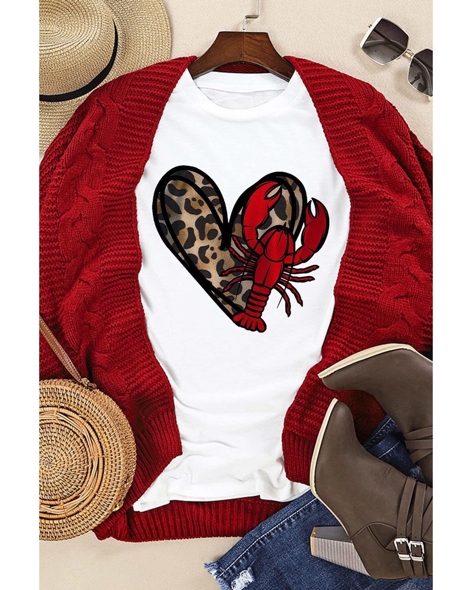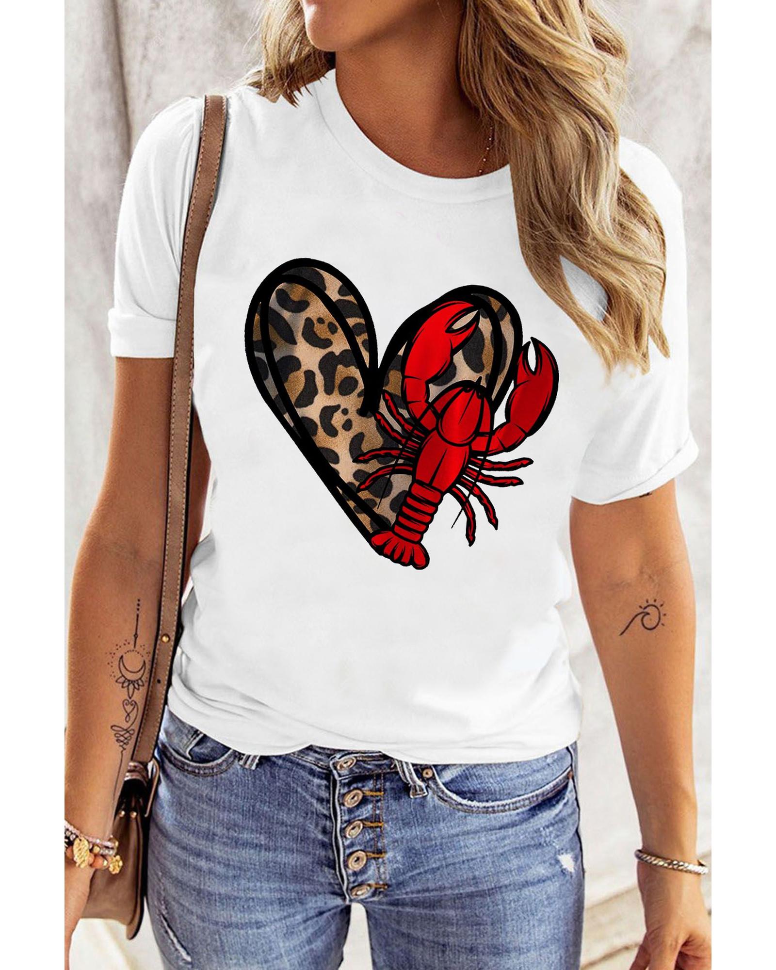 White Crawfish Leopard Heart Print Crewneck Tee – M