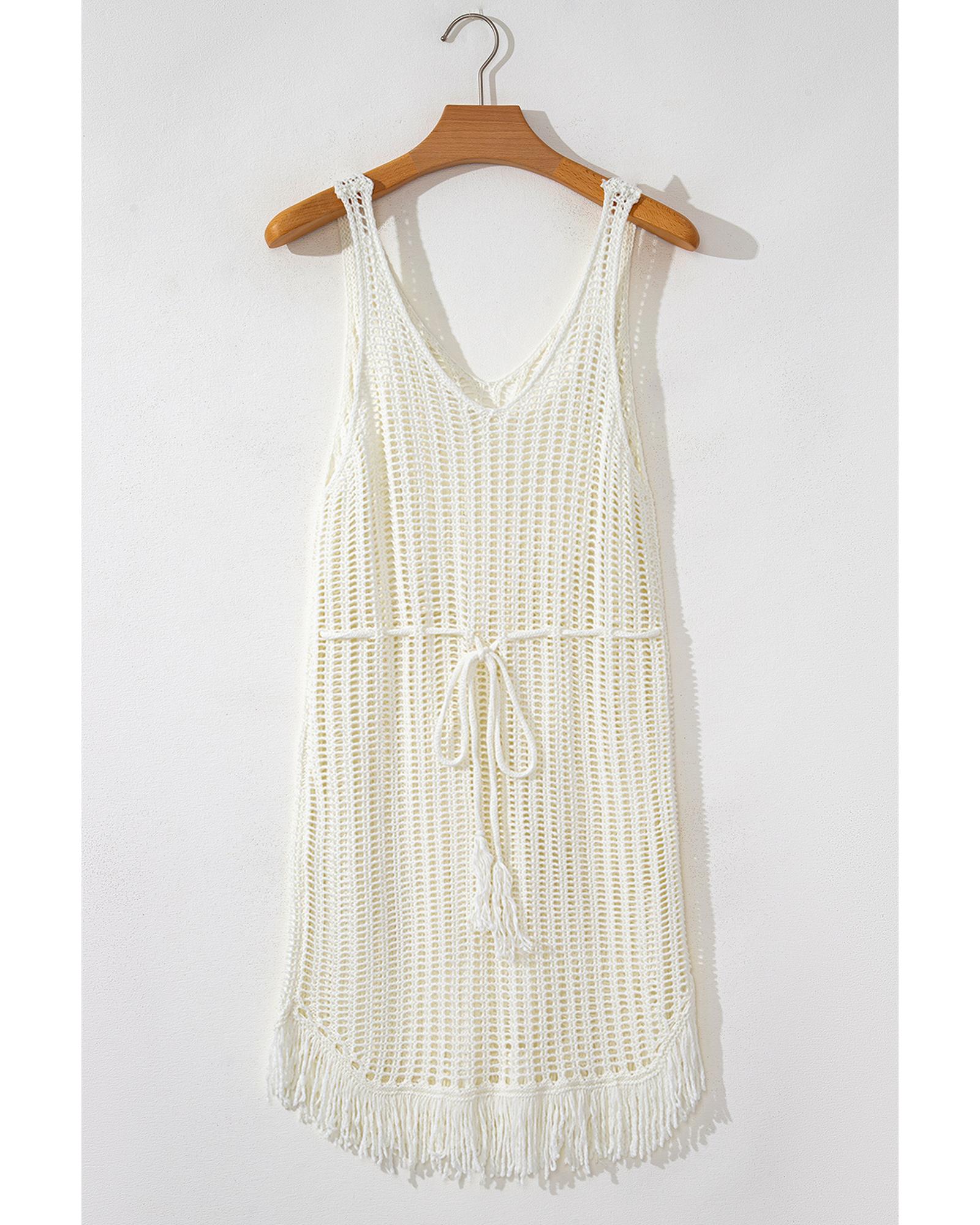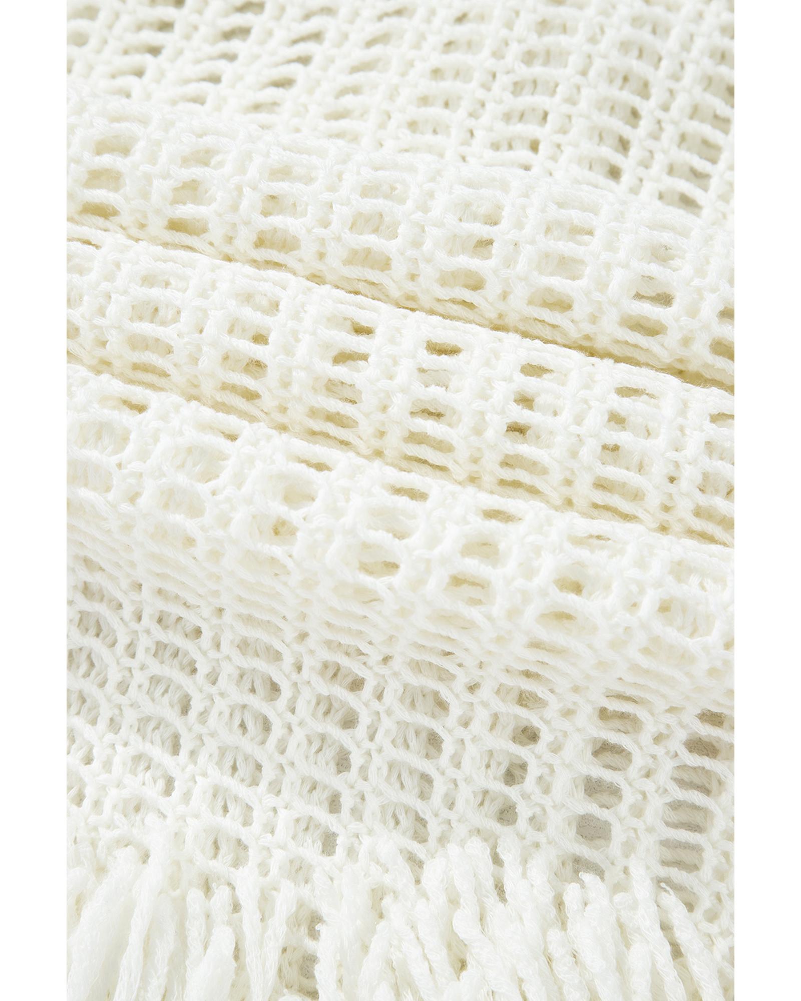 White Crochet Fishnet Fringed Edge V Neck Beach Cover Up – L