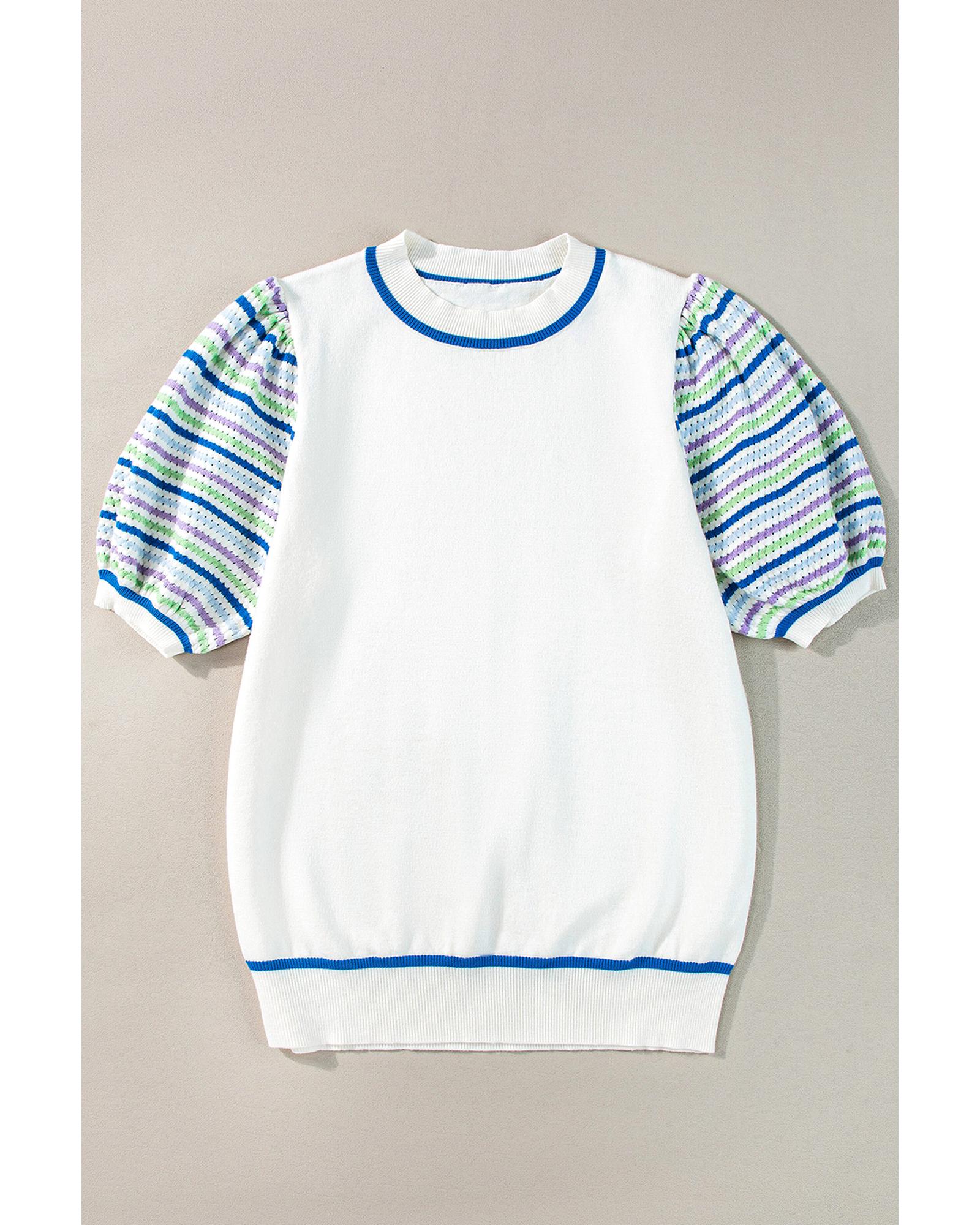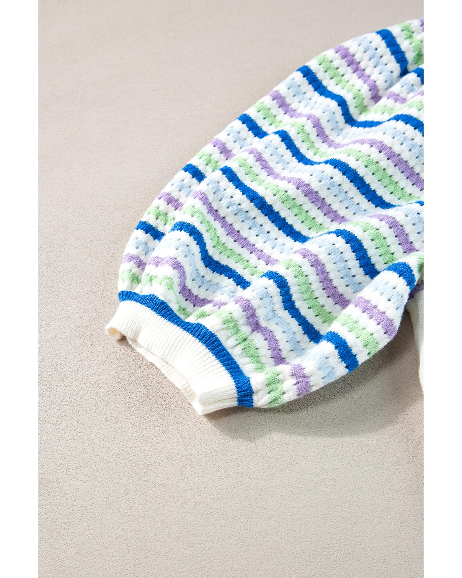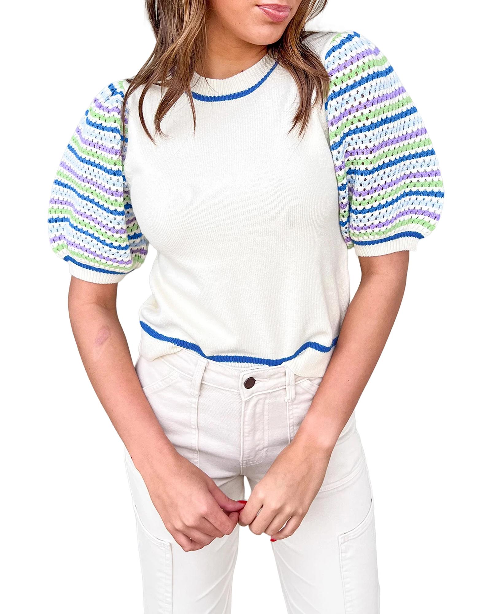 White Crochet Striped Bubble Sleeve Knit Sweater – M