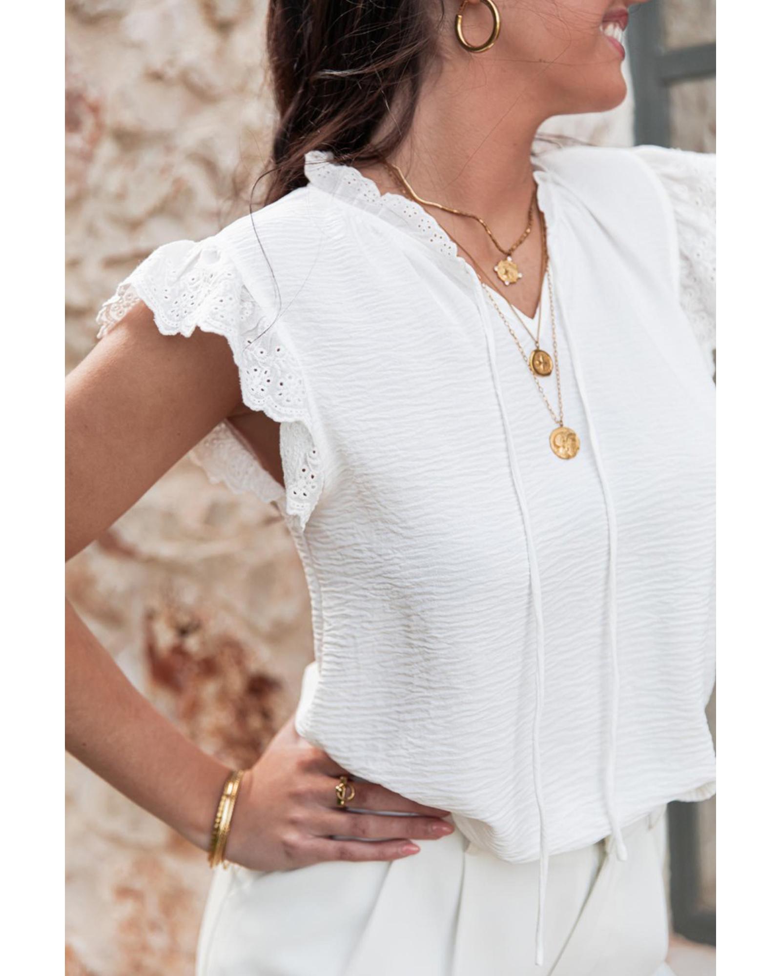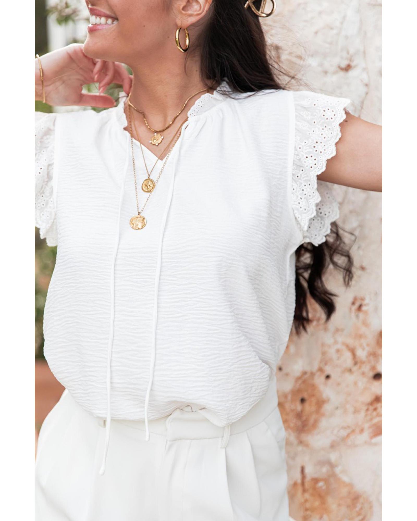White Embroidered Ruffle Trim Textured Blouse – XL