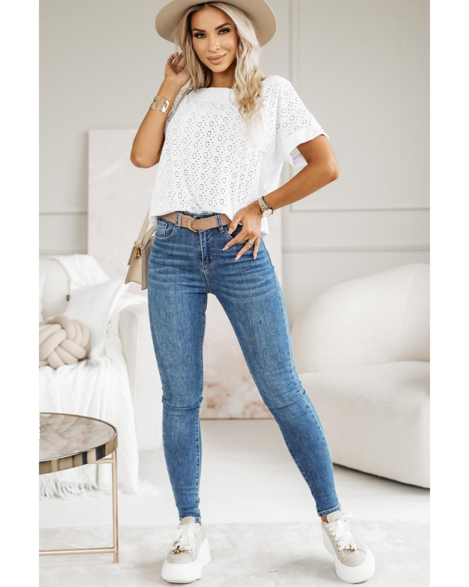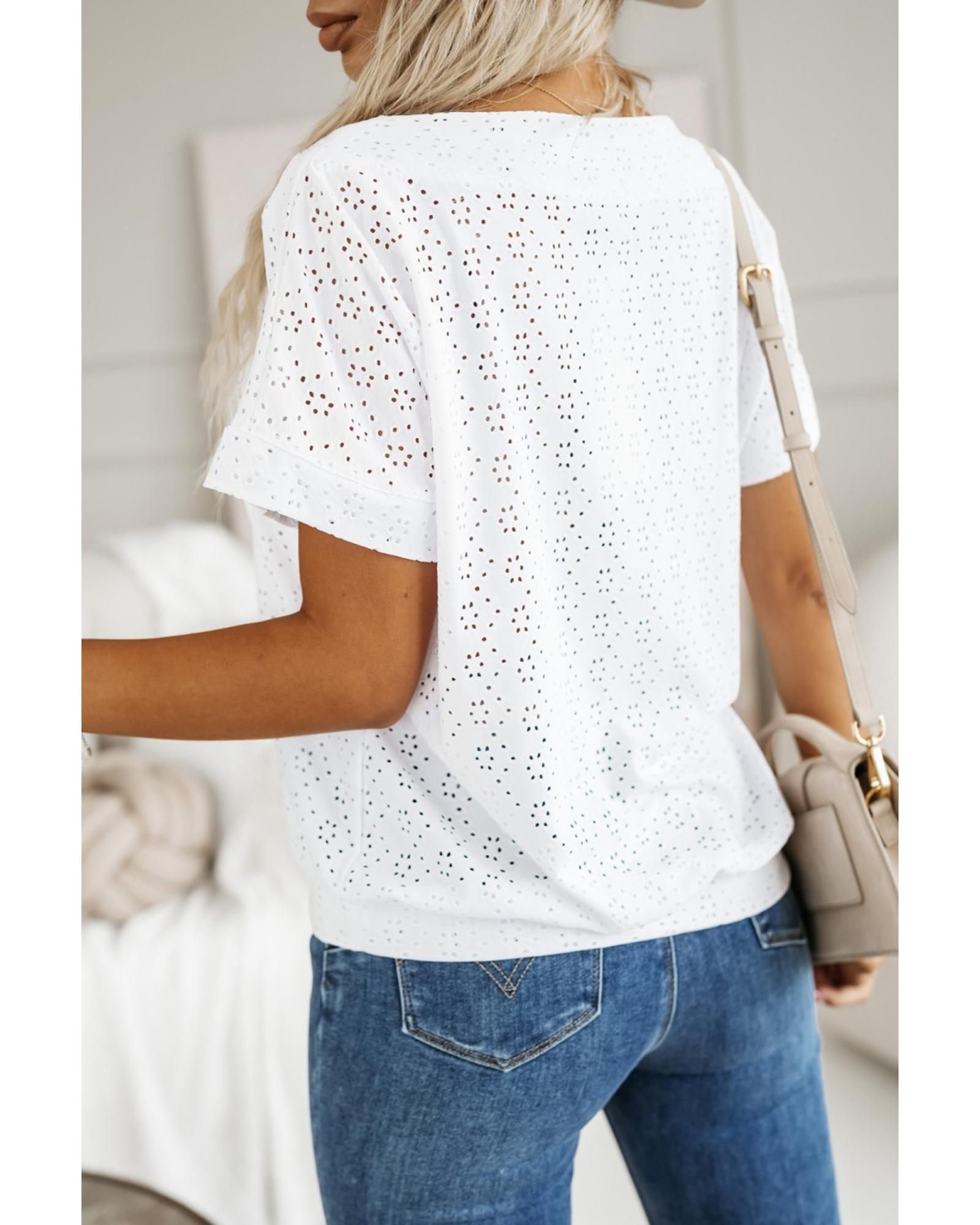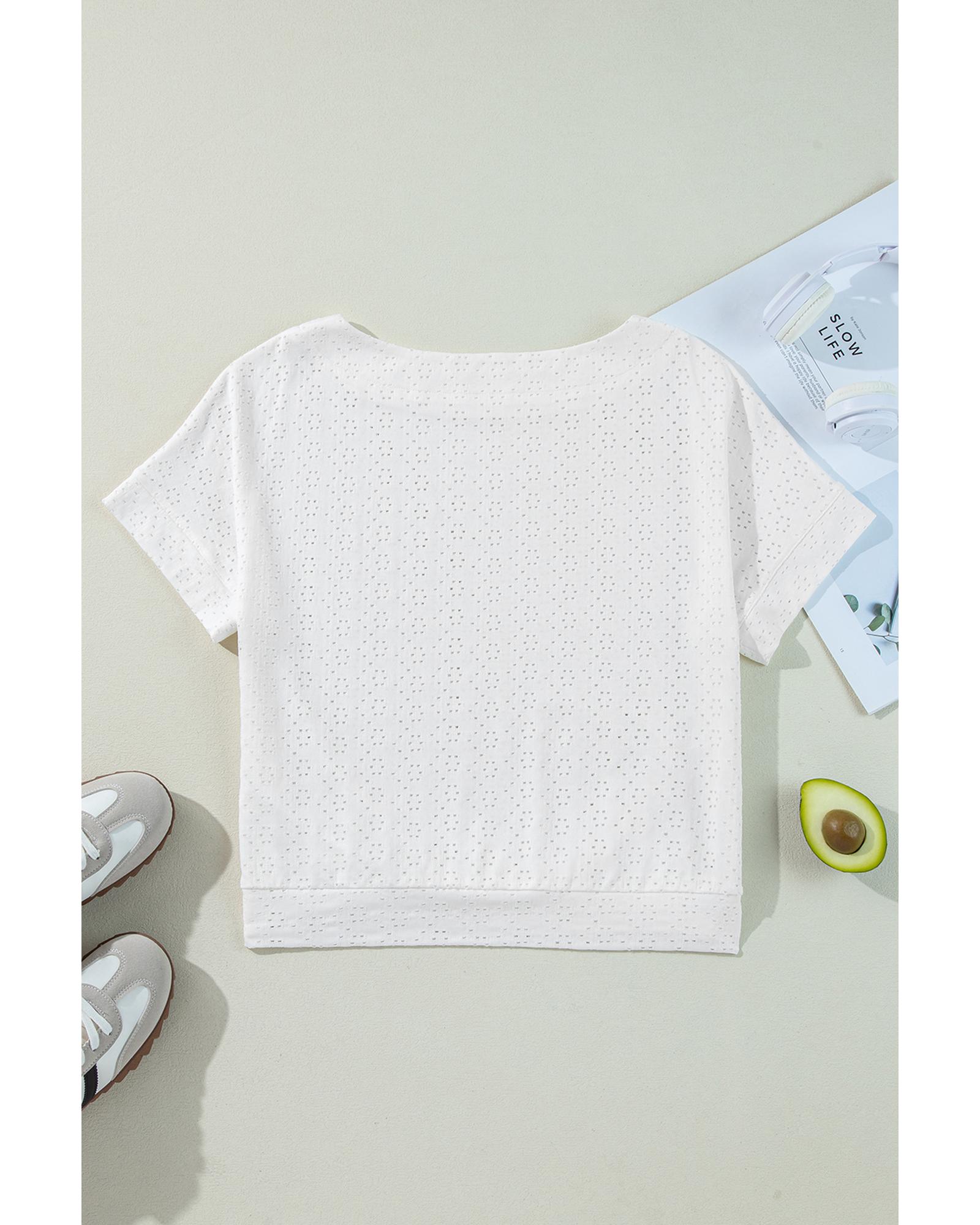 White Eyelet Pattern Boat Neck Casual Tee – S