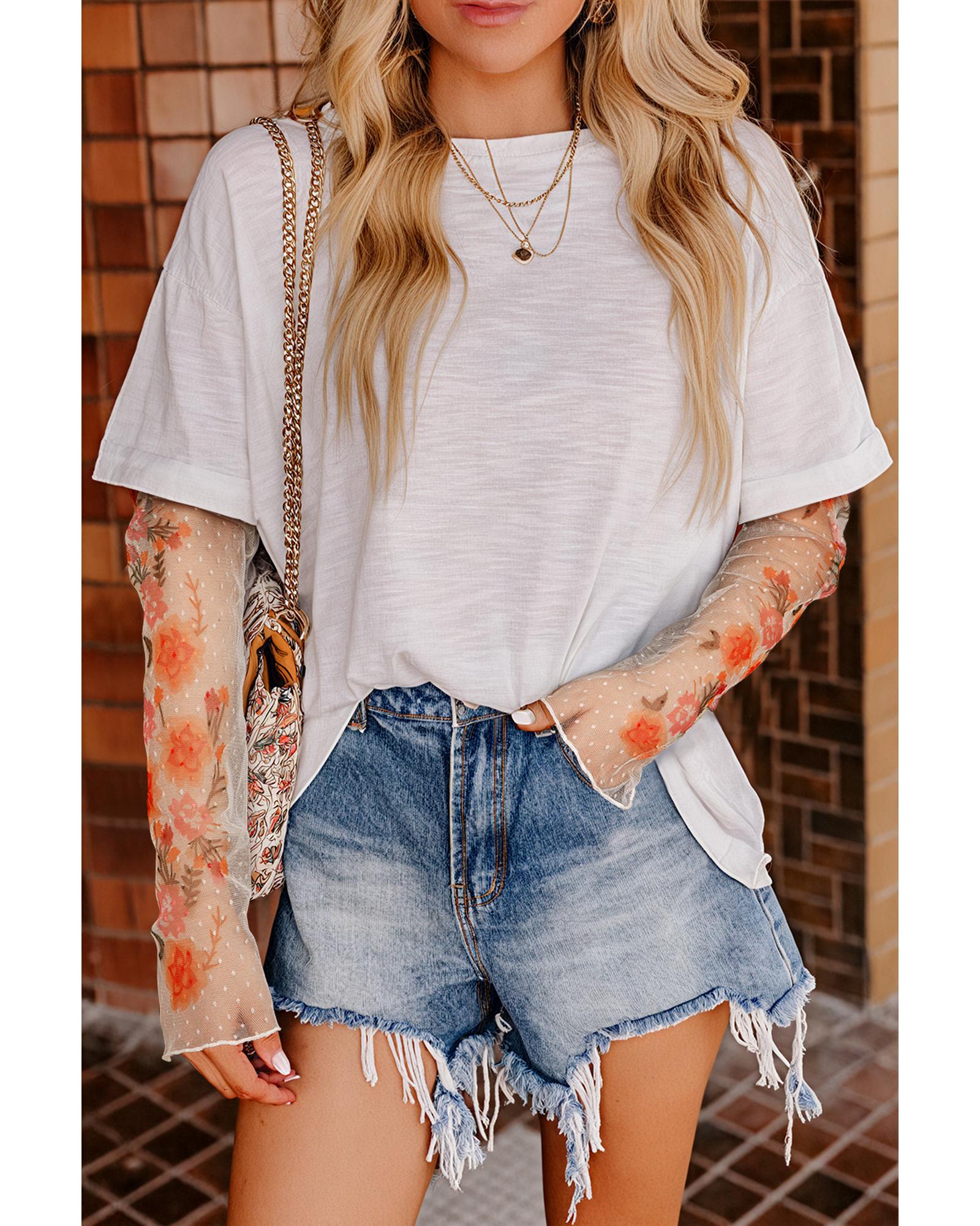 White Faux Two Piece Floral Long Sleeve Patchwork Tee – M