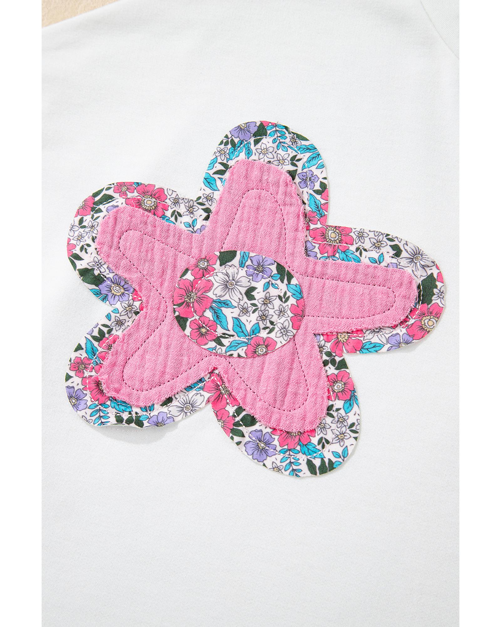 White Floral Applique Notched V Neck Dolman Sleeve Top – M