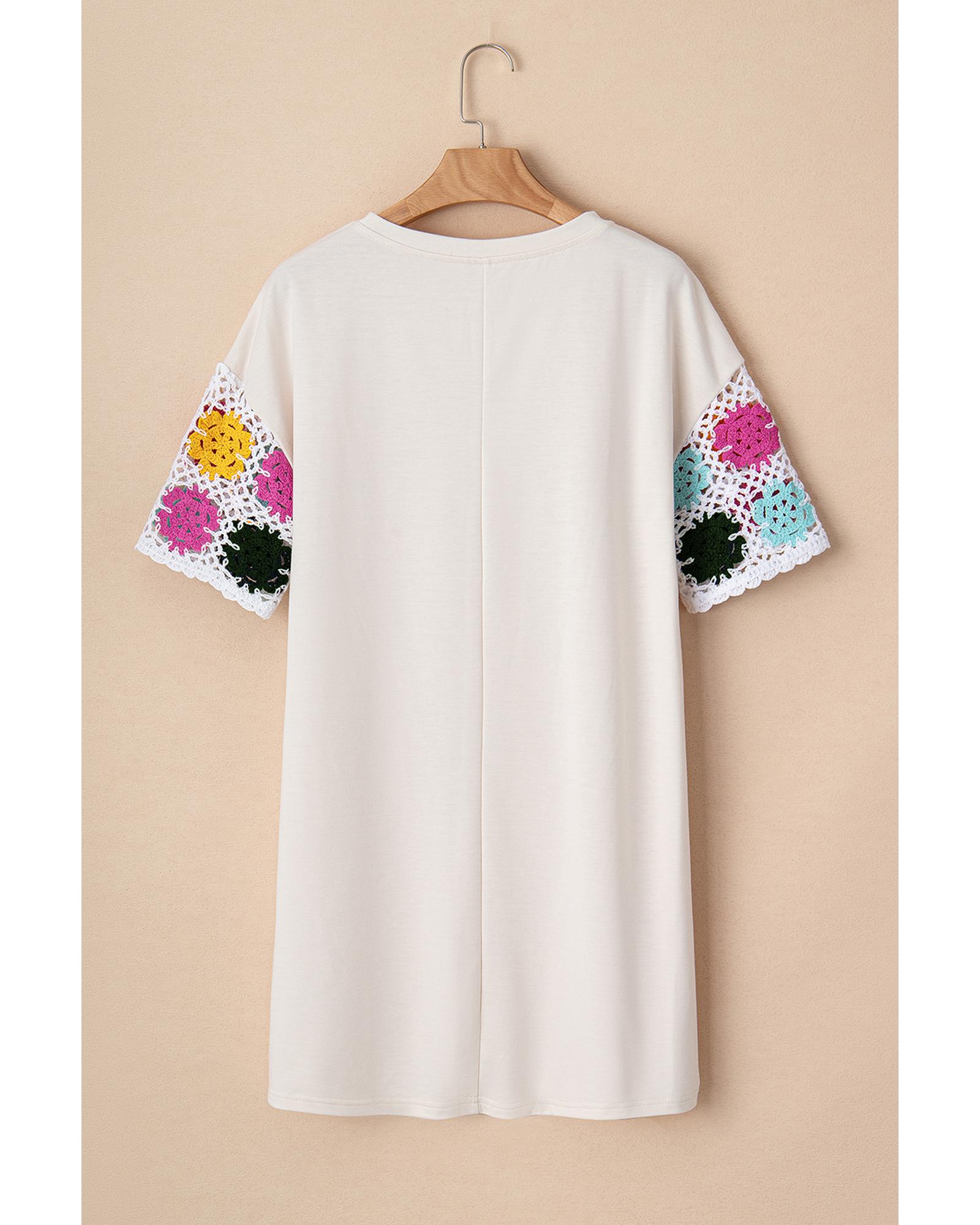 White Floral Crochet Splicing Sleeve T Shirt Dress – L