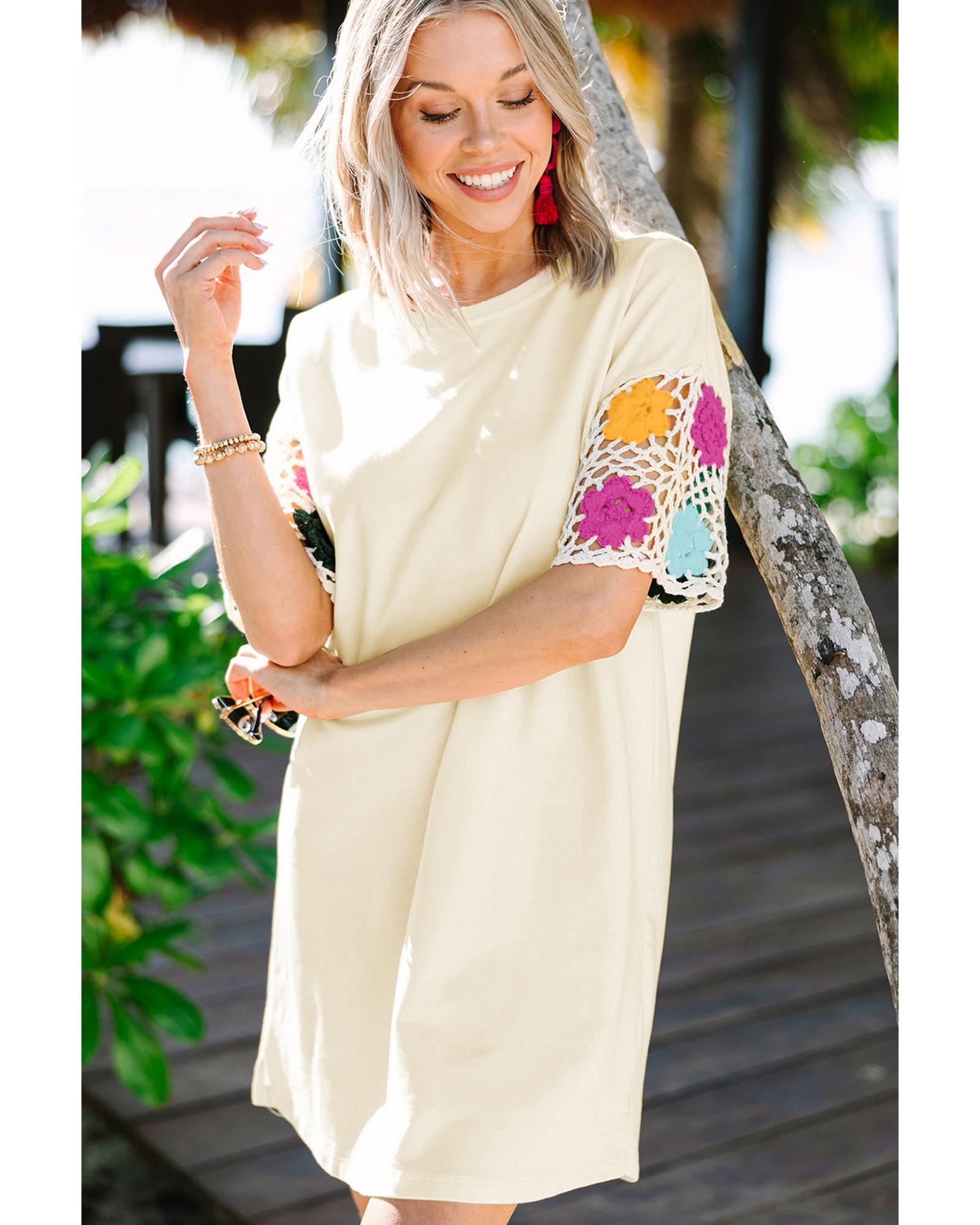 White Floral Crochet Splicing Sleeve T Shirt Dress – M