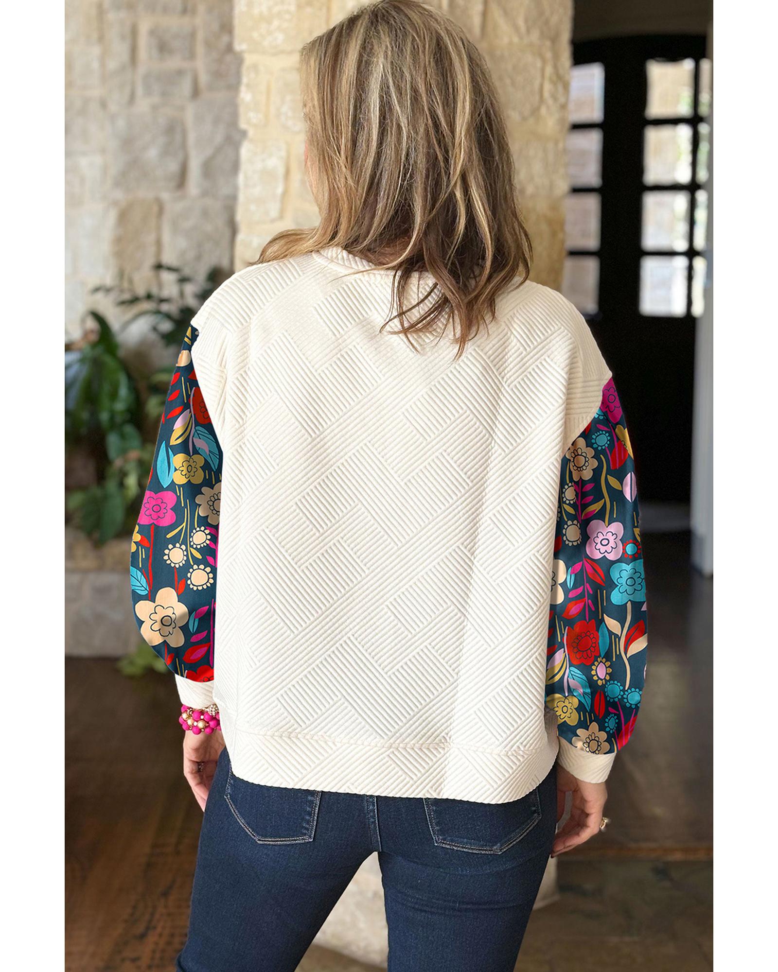 - White Floral Patchwork Sleeve Textured Plus Size Pullover Top
