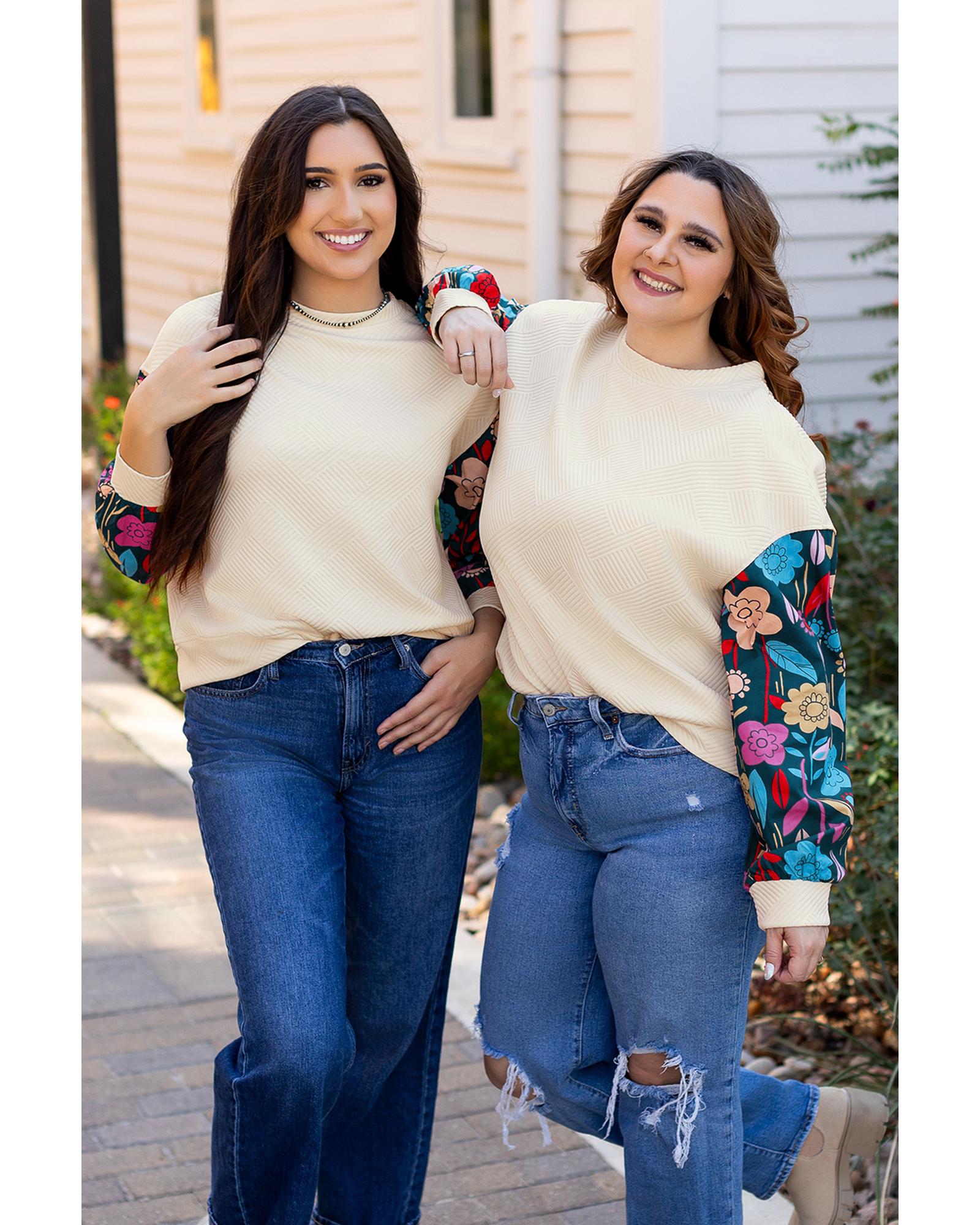 White Floral Patchwork Sleeve Textured Plus Size Pullover Top – 2X